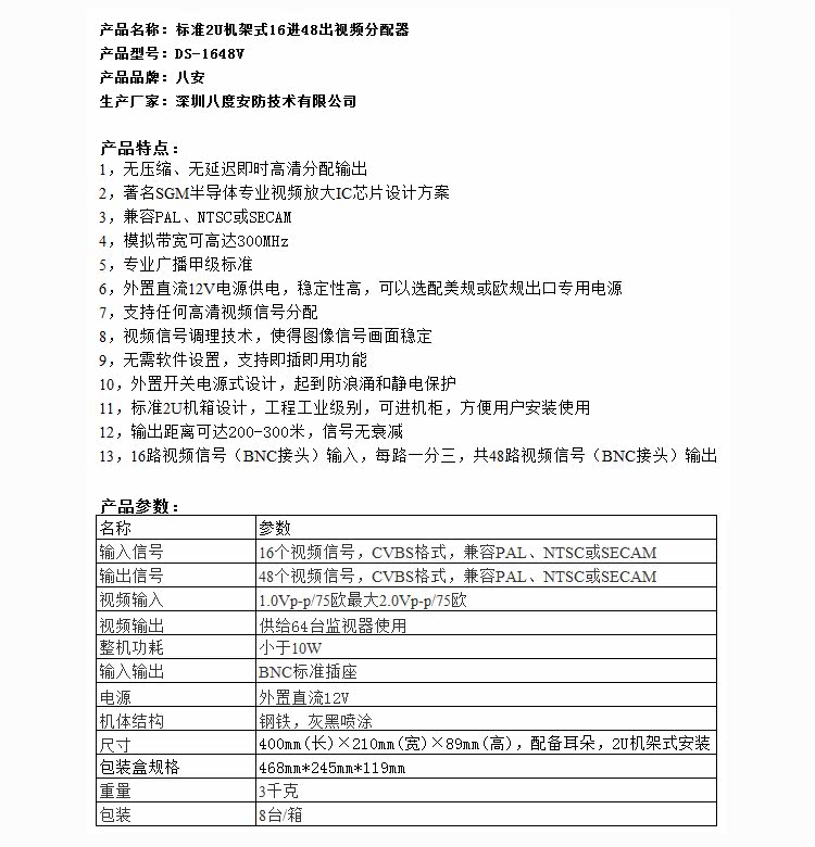 самый новый обновление Модель продукта: DS-1648HV. 16 входных, одна минута из трех, 48 выходов, полностью Face-совместимый HD-TVI, Dahua HD-CVI, MA MAI AHD, традиционный симуляционный сигнал, стойку частота Диспенсер, IC. чип Решение, выделение сигнала выходного изображения отлично; независимая цепь усиления, убедитесь, что вывод без Затухание, беспокойство вмешательства, без Разница в цвете постоянна, а не предвзятости; Бренд Ba'an, полностью новый обновление Продукт, страхование на два года, полностью страна бесплатная доставка по китаю Отказ Примечание: DS-1648V, это старое стиль модель, только Подходит для традиционных аналоговых сигналов. DS-1648HV и DS-1648V та же цена. продукт имеет Ремень баан логотип и без Логотип, случайная доставка. Или стрелять низ вперед пожалуйста Проконсультируйтесь с владельцем; или работник телефона, 13826553690.