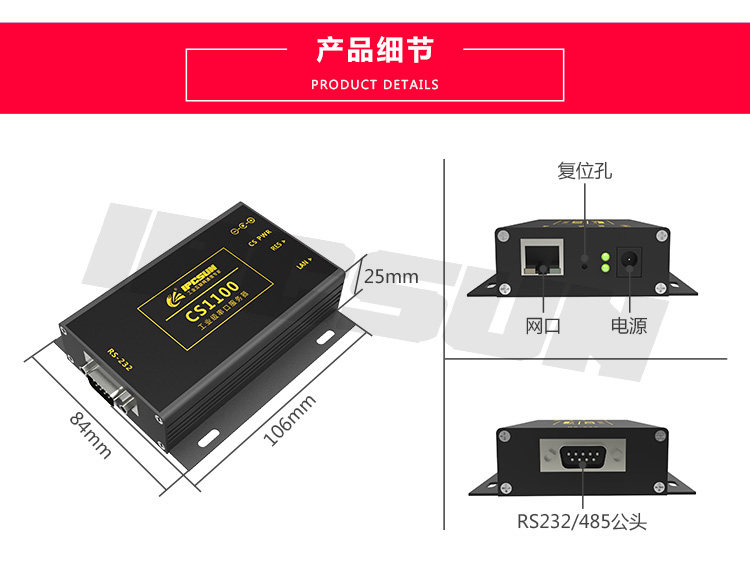 Серийный сервер промышленного класса 1 Последовательный поворот RS232 RS232 Ethernet Портовый порт Ethernet один Напряжение последовательной ширины CS1100