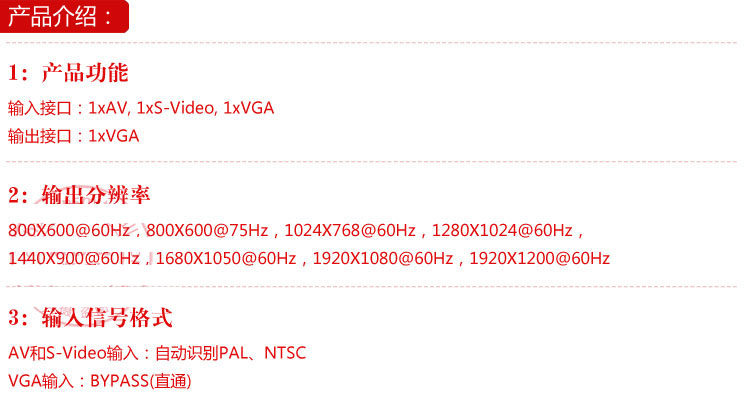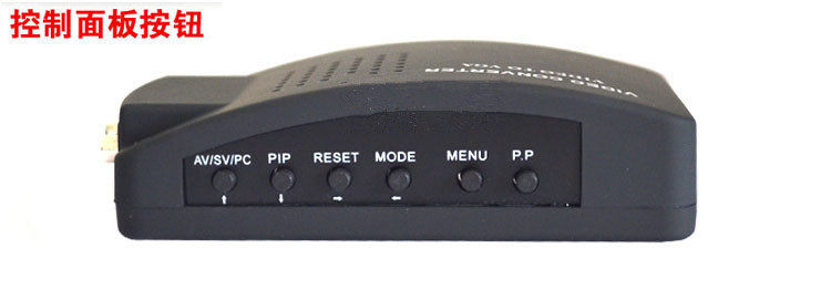 Можно увидеть частота Сигнал с разъема AV или сигнал S-конца преобразуется в сигнал VGA, то есть вход AV или S-конца и выход VGA, который можно подключить к VCD / DVD / видеокамере / имеет Линия ТВ приставки / IPTV / PDP / др., Пусть ваш монитор, с проекцией Вы также можете прочитать количество слово ТЕЛЕВИЗОР.