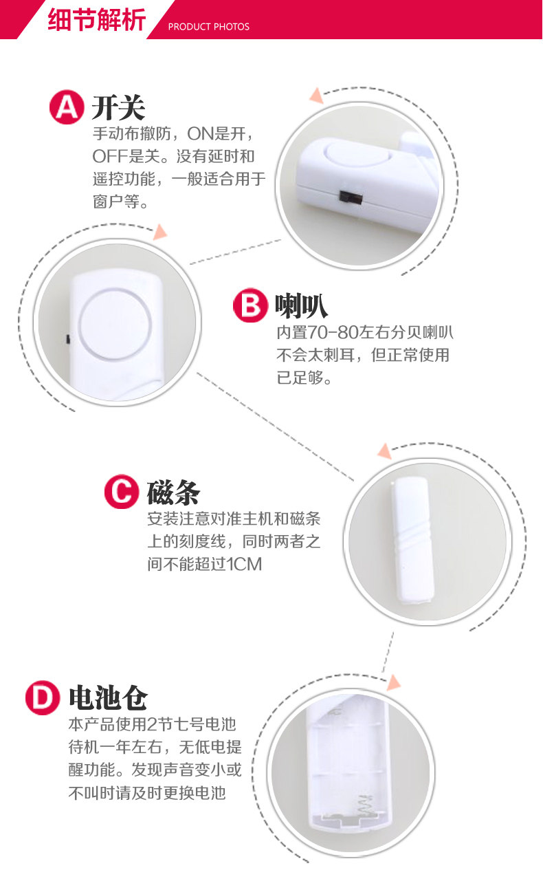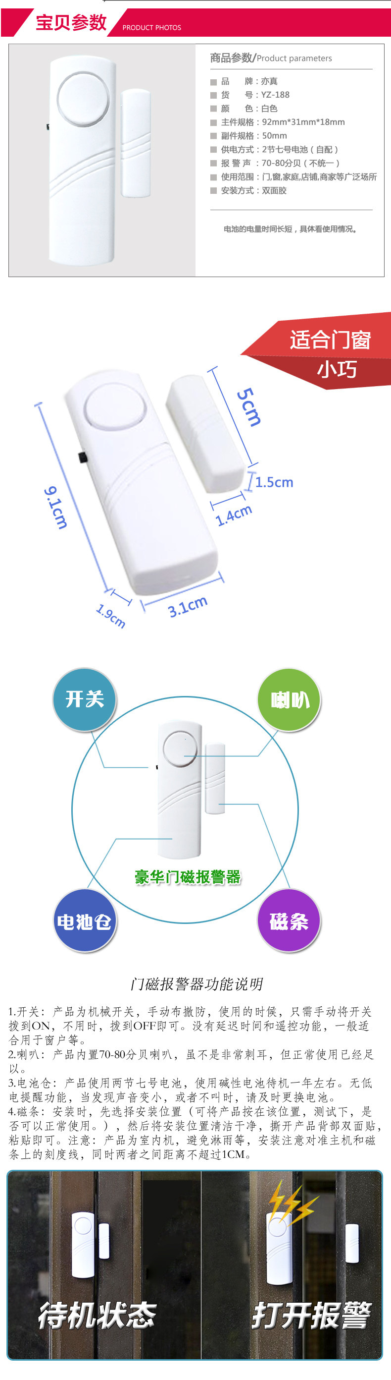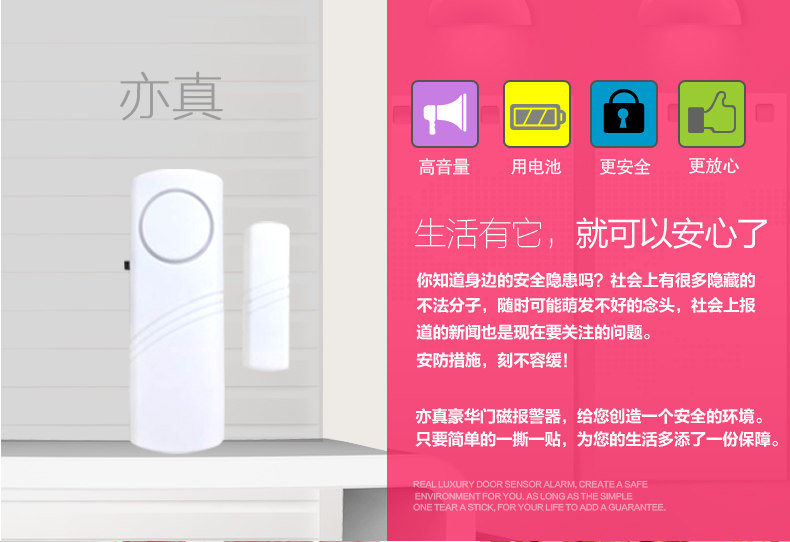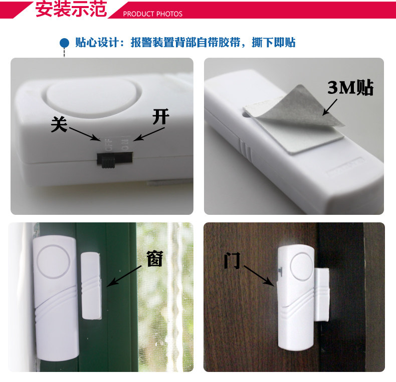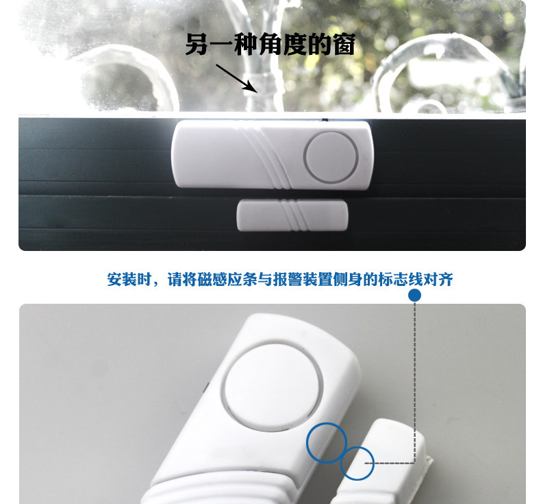& amp; nbsp; & amp; nbsp; Изделие маленькое и изысканное, установка Простой, прилагаемый двусторонний скотч легко установка в дверь или же окно верх , Это разновидность дешевых, качественных, экономичных и практичных технических профилактических мероприятий. В нашем районе, уже Это полностью подтверждено жителями и полицией. только Основную и вспомогательную части нужно наклеить на дверь с участием дверь Рамка верх , Или два окно верх И выровнял(Оставьте 5 мм слева справа зазор). Однажды вор любопытный дверь , любопытный окно , Попытка кражи(Разделение основной и вспомогательной частей), Сигнализация может издавать сильную сирену, чтобы отпугнуть воров и напомнить владельцу и окружающим, что нужно поймать воров. Я хочу водить дверь , окно Когда, может быть переключатель контроль. Подходит для защиты от краж жилых домов, офисов, прилавков магазинов и т. Д.