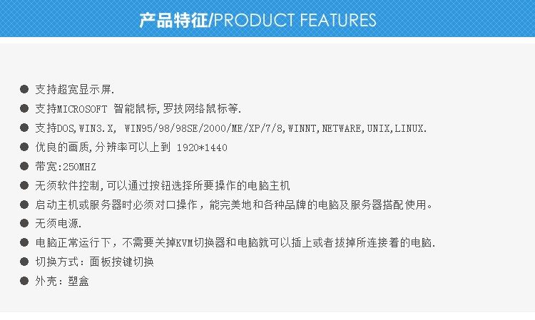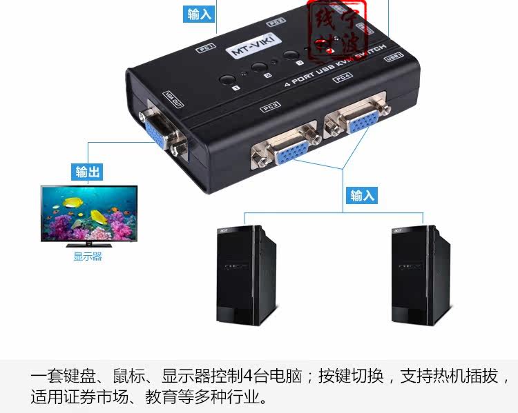 1 набор клавиатуры, крысы стандартный , Дисплей контроль 4 компьютеров; нет необходимости установка программное обеспечение, кнопка Переключение, поддерживая термический плагин, применимые рынка ценных бумаг, образования и других отраслей промышленности.