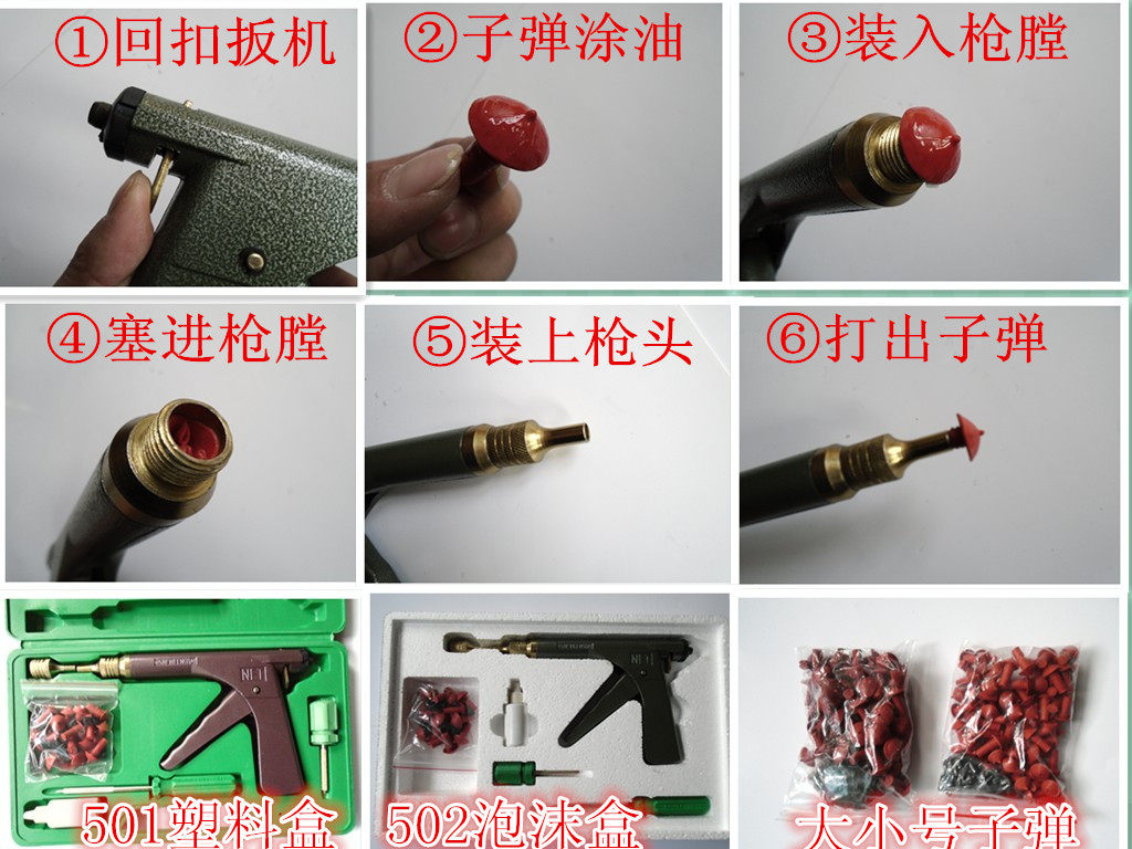 2) Поместите резиновую пулю: нажмите скидку на пополнение шин, так что предварительный стержень вернется в окончательную позицию.Согласно размеру Chuang Kong, выберите различные типы резиновых пуль, нанесите смазку, вставьте хвост резиновой пули в ствол, используйте тонкий конец небольшой головки пистолета, чтобы толкнуть резиновую пулю) Вы можете выбрать соответствующую головку пистолета ротация.