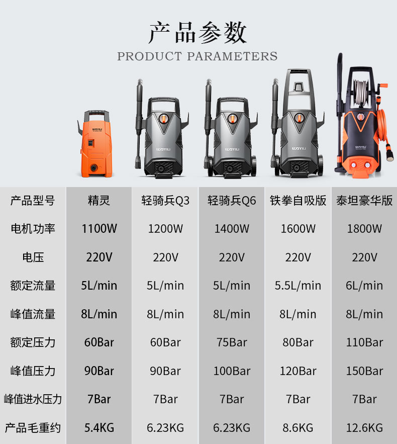 & amp; nbsp; Введение в продукт: | ①Мощность Hussar Q3 - 1100Вт, давление - 90Бар без колесообновление. ②Гусарский Q6разумный версияМощность 1400 Вт, давление 100 бар, входная труба 3 метра и выходная труба 8 метровобновление. ③Tekken 1500Вт, давление 110Баробновление1600 Вт, длинная ручка 120 бар + ролик. |