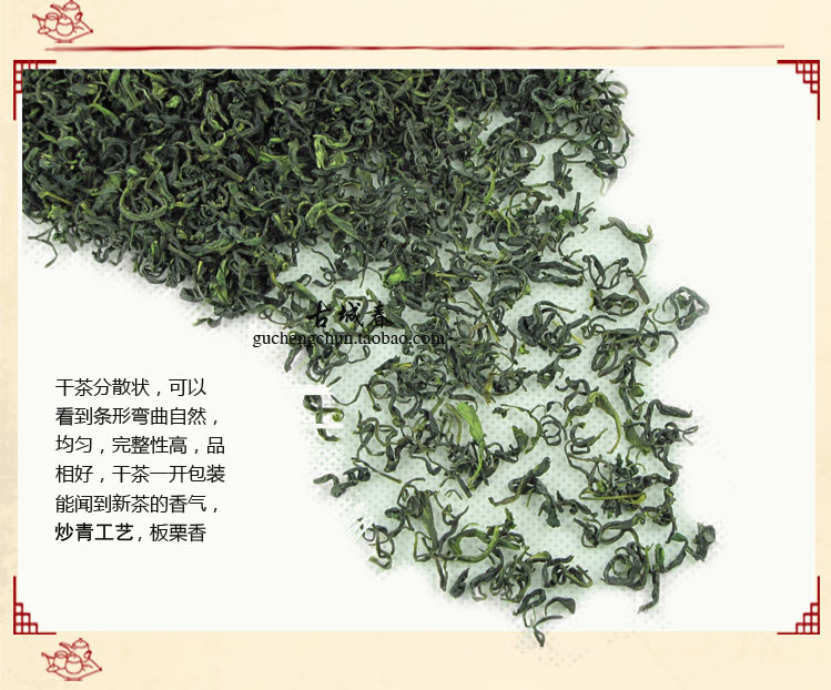 это стиль Характеристики чая: ①Без химических удобрений, зеленый чай Жичжао новый чай! ②Вкус: сильный аромат солнечного зеленого чая, аромат высокая , Хорошо быть сладким, и аромат во рту после питья толстая ! И сопротивление пены очень хорошее! Вкус, который очень нравится давним покупателям чая! ③Чай полосатый Форма однородная, а цвет сухого чая - темно-зеленый!