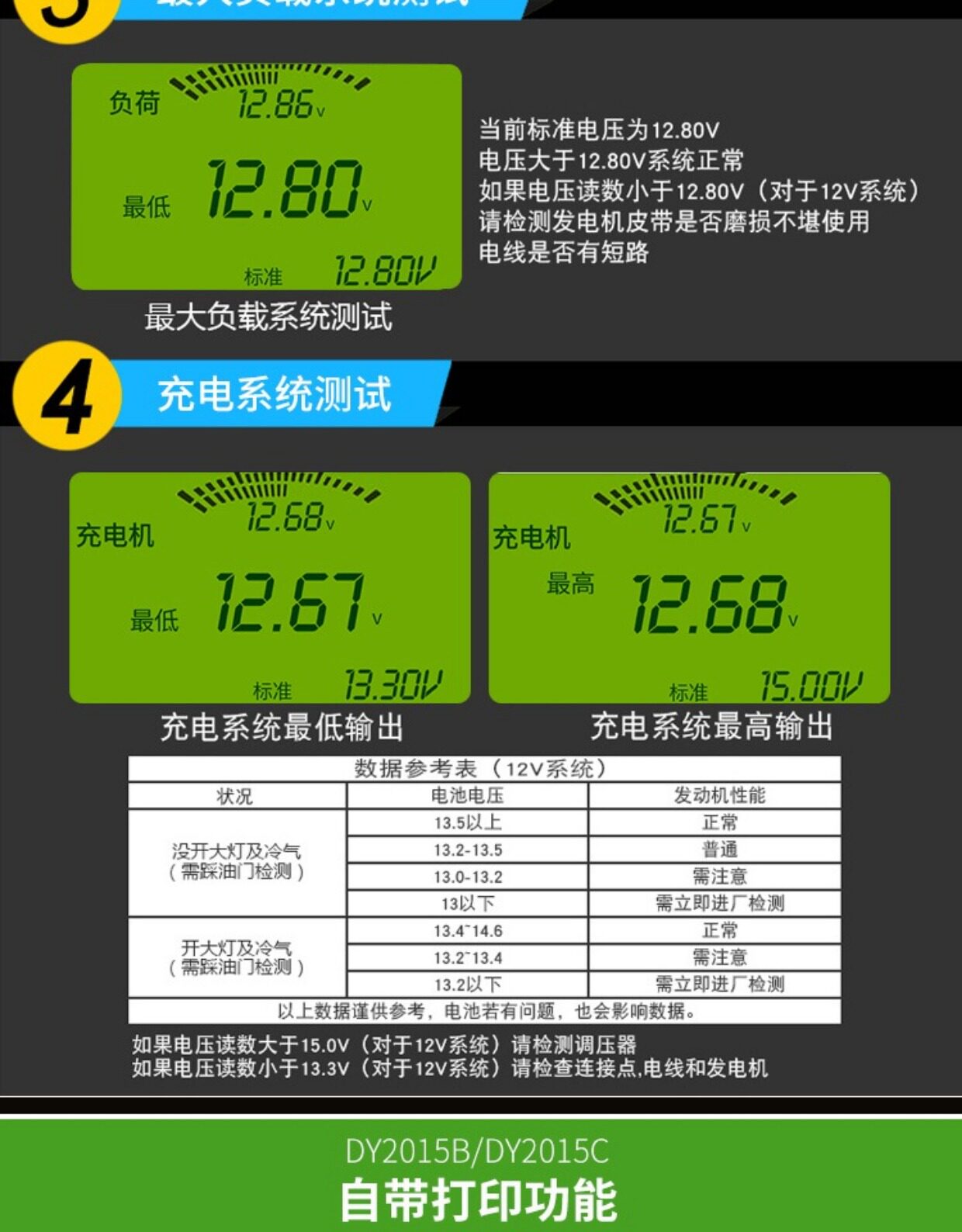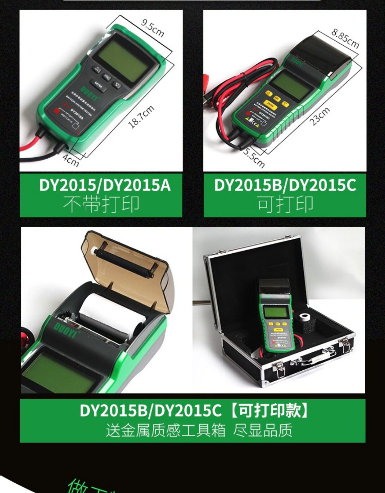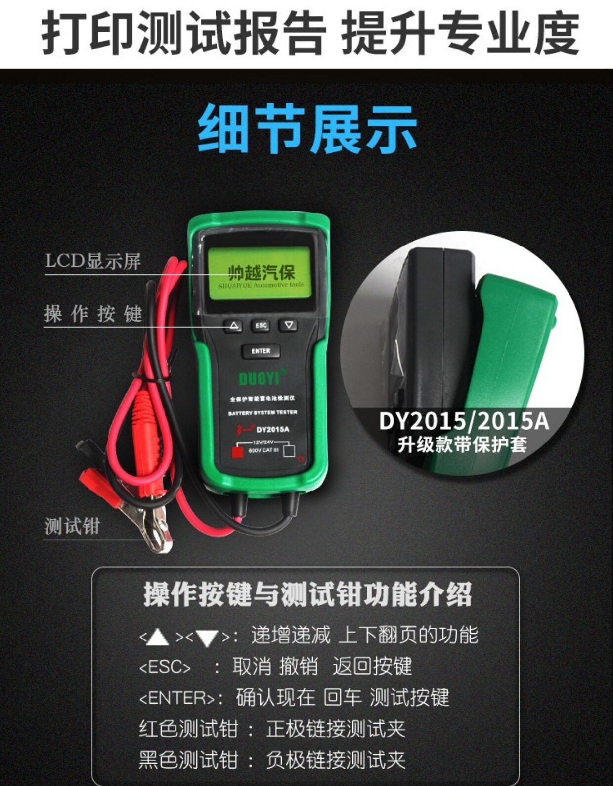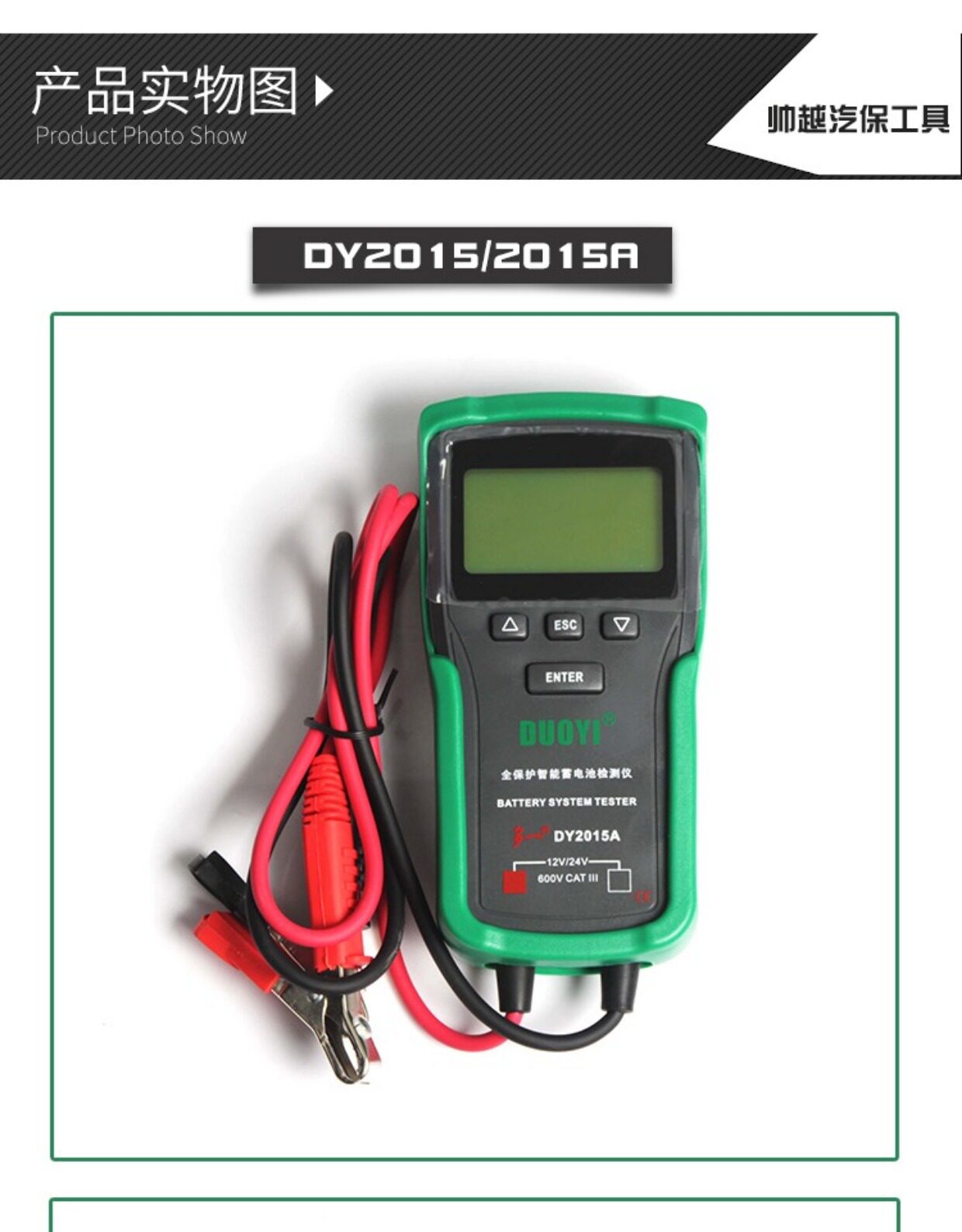 Цвет: 12V обновление стиль DY2015, 12/24V обновление стиль DY2015A, DY2015B 12V Поддержка печати Протокол, DY2015C 12 / 24V поддержки отчета о тестировании печати, Детектор батареи 12V-24V DY222