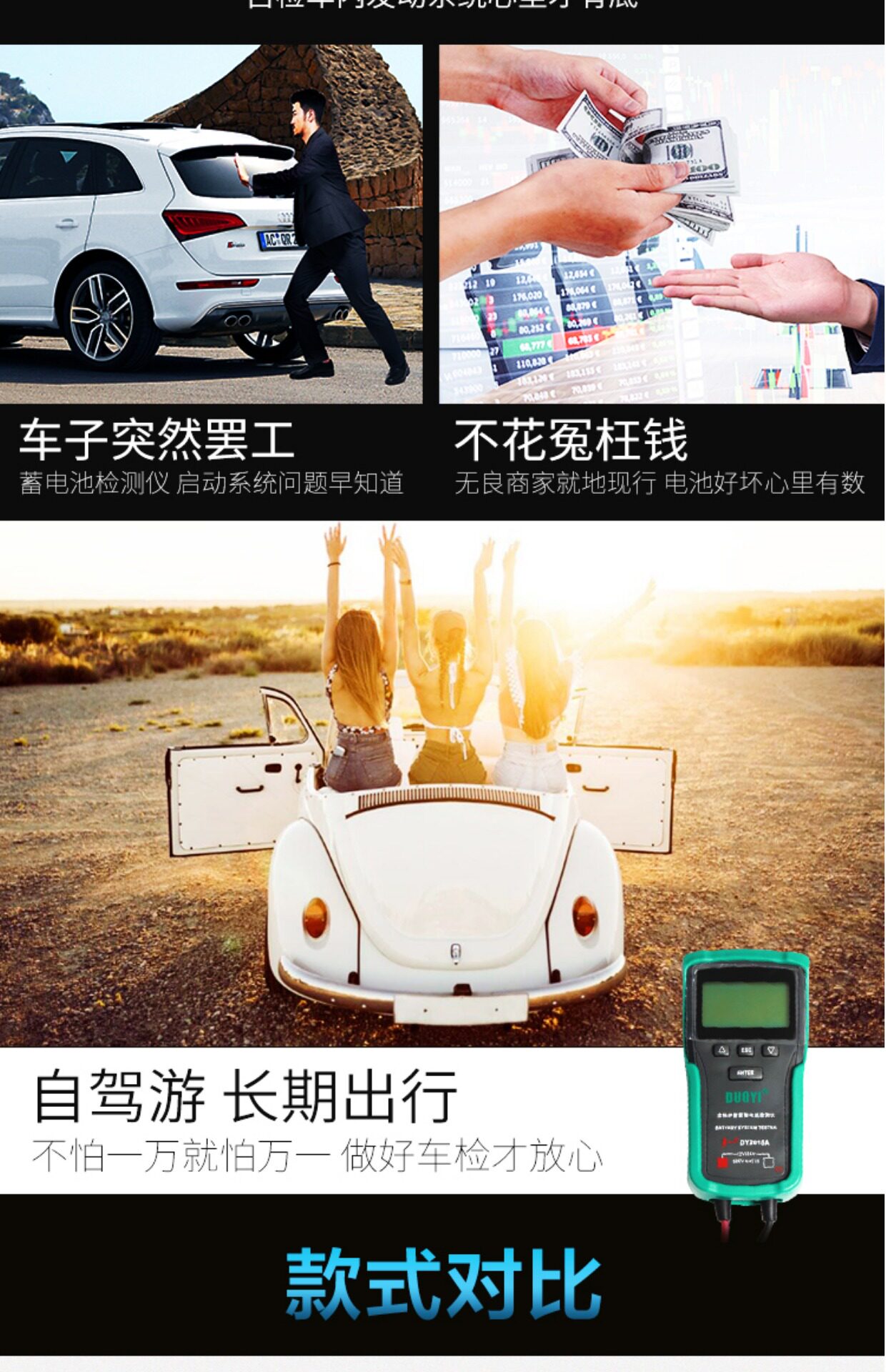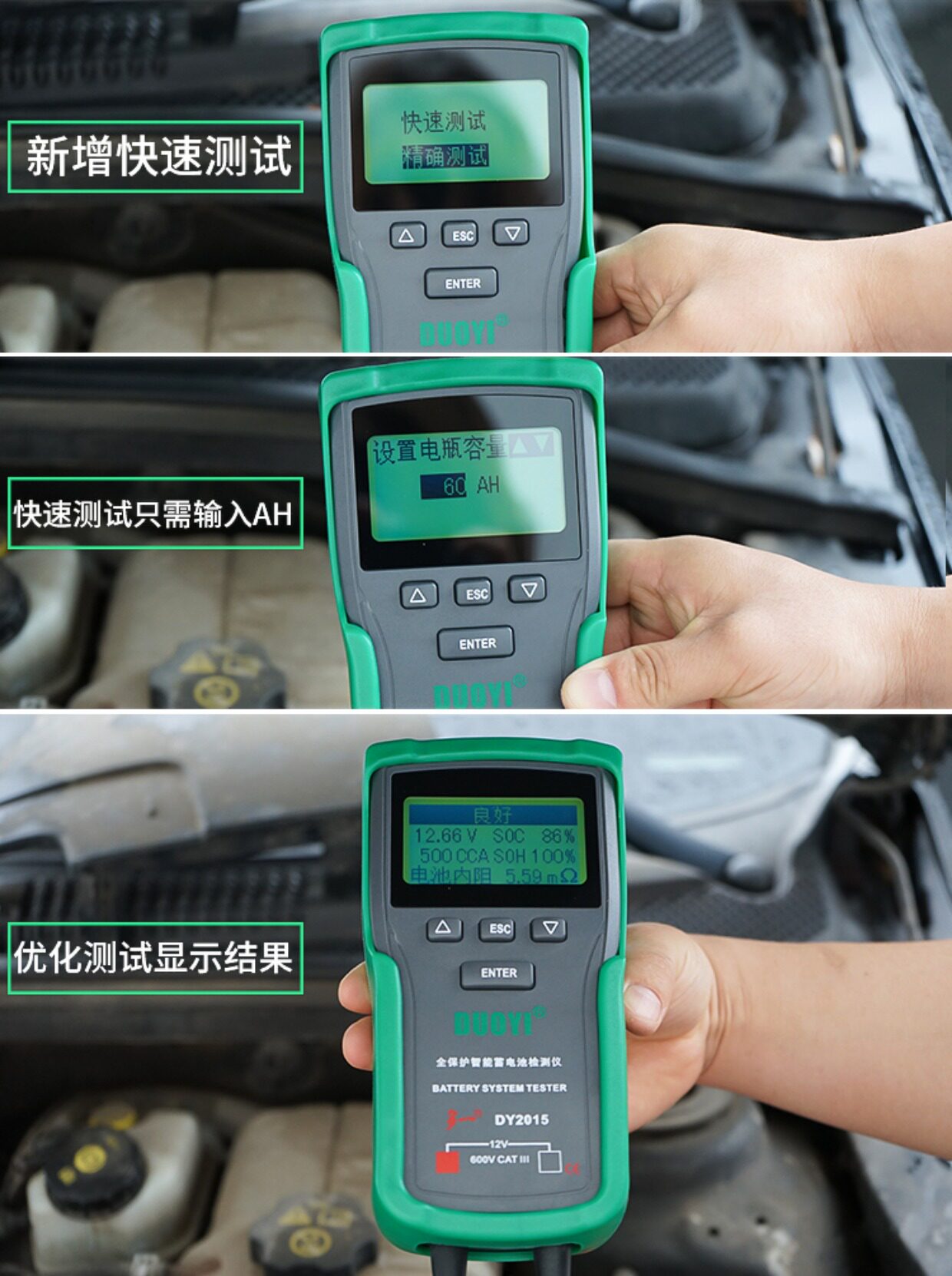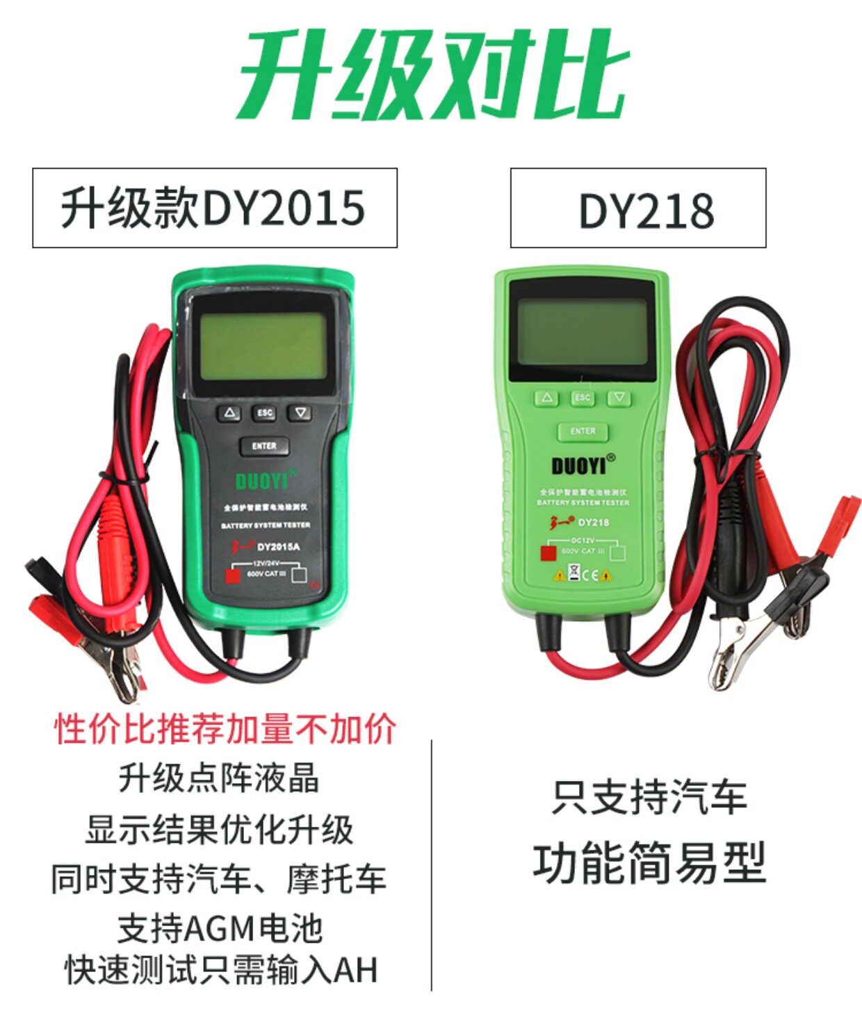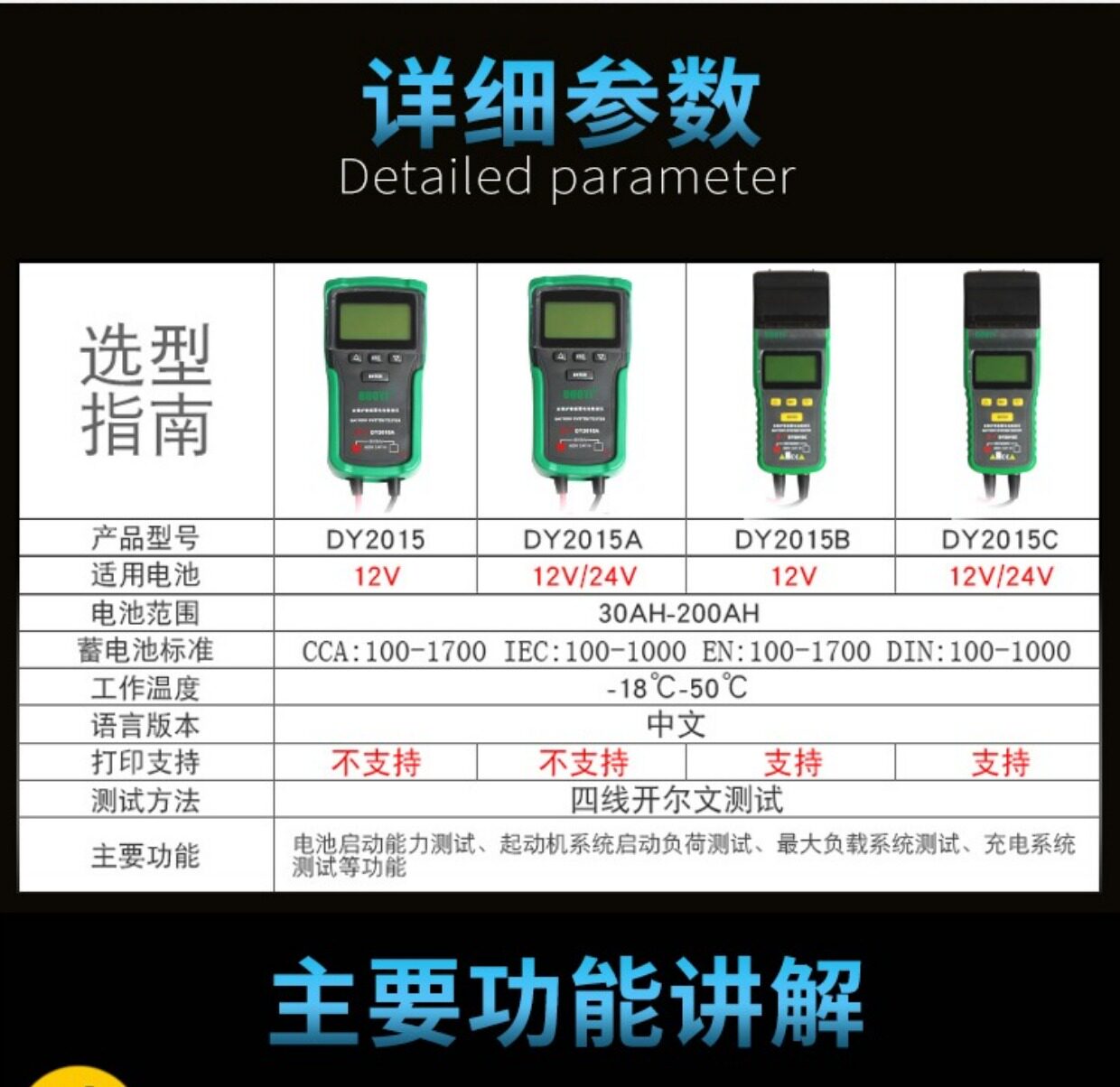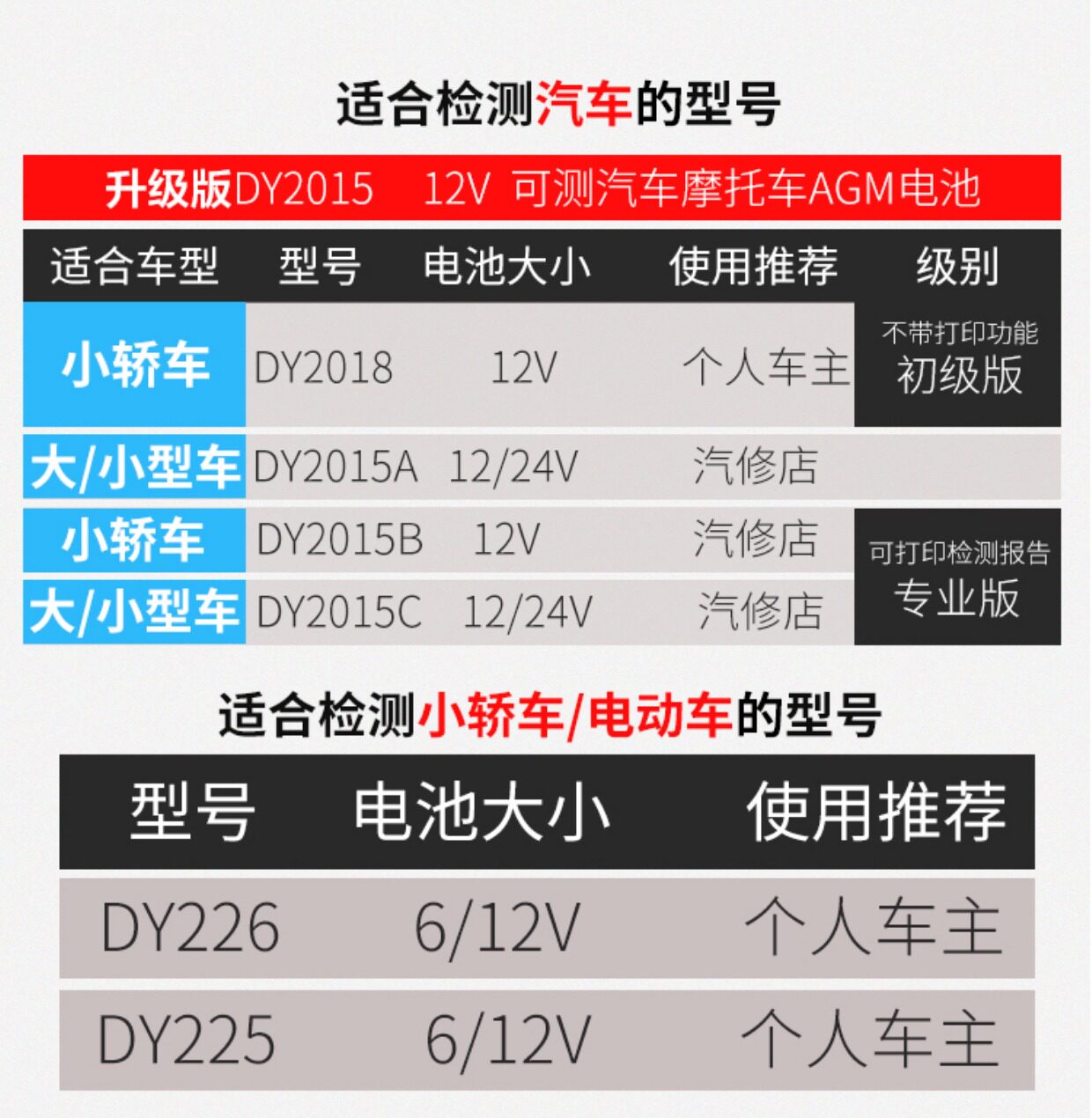 Цвет: 12V обновление стиль DY2015, 12/24V обновление стиль DY2015A, DY2015B 12V Поддержка печати Протокол, DY2015C 12 / 24V поддержки отчета о тестировании печати, Детектор батареи 12V-24V DY222