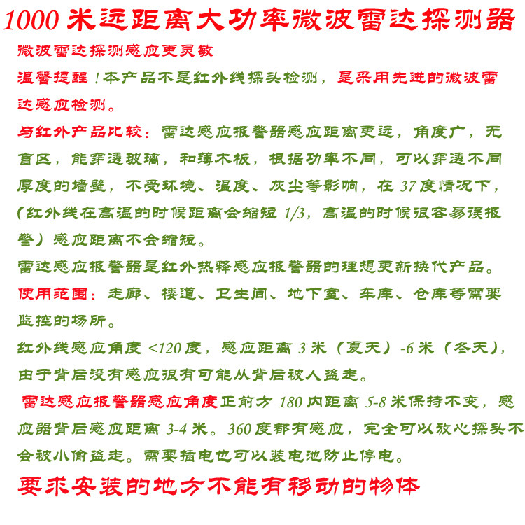 Советы:Чтобы улучшить это стиль Функция сигнализации хорошо выполнена, и извещатель подходит для установка В помещении или на открытом воздухе; не находиться рядом имеет вмешательство радар Датчики деревьев или других движущихся объектов, датчики-извещатели не водонепроницаемый , пожалуйста Сделайте детектор водонепроницаемый Меры; если между детектором и хостом имеет Блок препятствий, сокращается дальность старта; радар Детектор может проникать через 2 см не металлический объект, пожалуйста Настраивать установка Расположение, чтобы избежать ложных срабатываний!