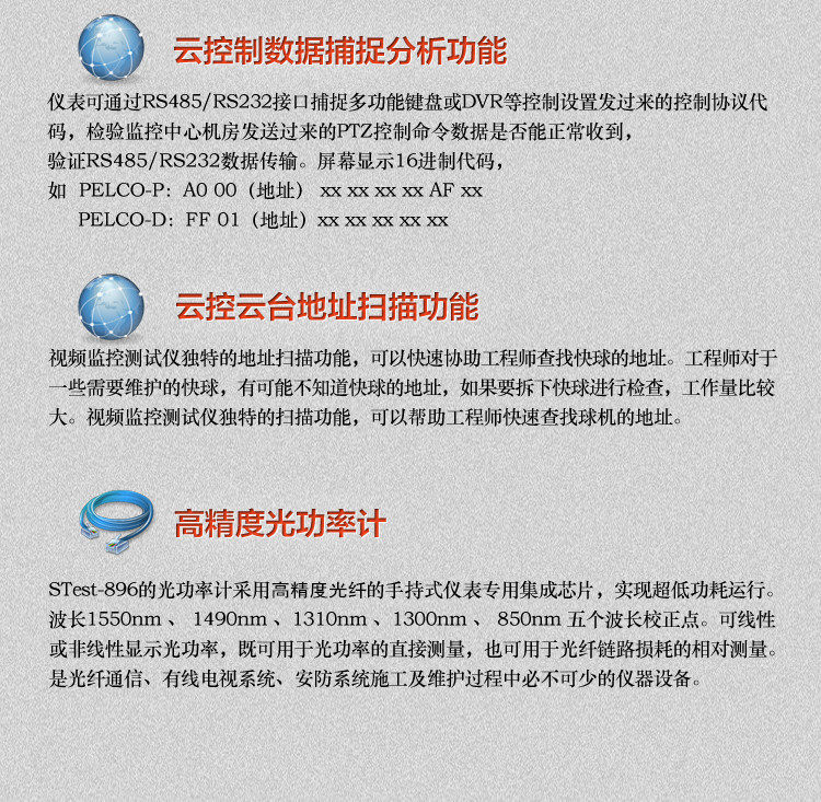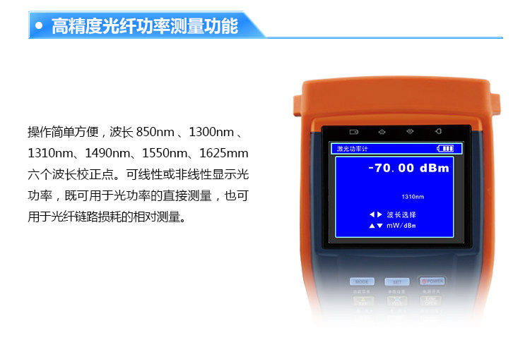 3.5 - -вдрудочный экран, тест мощности оптического волокнаСвнутренний В высокая Прецизионный волокнистый счетчик связи. Оптическая функция тестирования мощности инструмента для измерения частота Оптическое значение мощности оборудования для оптической связи, такого как световые машины и оптические передачи, и проверка ослабления оптического волокна в связи с оптическим волокном и т. Д. для инструментДлина волны испытаний 850 нм/1300 нм/1310 нм/1490 нм/1550 нм, диапазон испытаний -70—+ 10 дБм или -50—+ 26 дБм, китайский язык Рабочий интерфейс, использование один Применимо к различным проектам оптических коммуникаций.