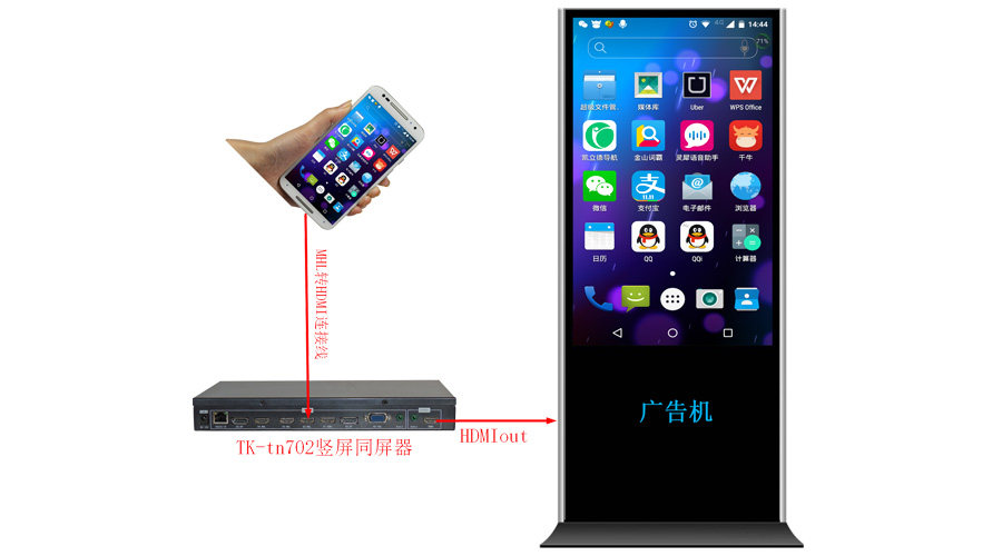 В настоящее время телефоны Android 4.2 и новее верх версия Эта функция поддерживается этим, Iphone5 и Iphone6, только Нужно добавить один обычный Подключите свой мобильный телефон с таким же экраном к нашему устройству. После настройки интерфейс мобильного телефона и другой контент могут отображаться на вертикальном экране. Схема подключения приведена на схеме топологии в конце этого документа.