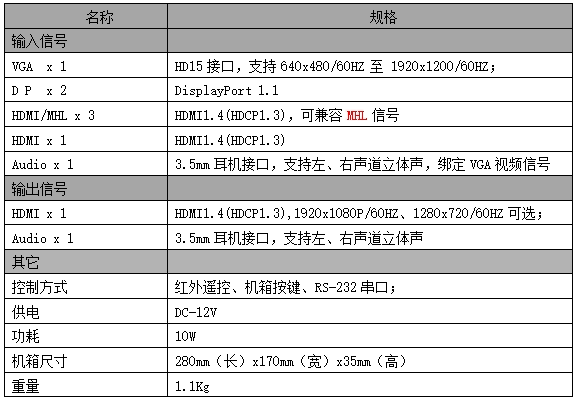 Поддержка 1 VGA, 2 DP(DisplayPort), 4 HDMI(Совместим с MHL), 1-канальный аудиовход (сигнал VGA в комплекте), входной сигнал самый высокая Может поддерживать 1920 * 1200 при 60 Гц и низ совместимый. & amp; nbsp;