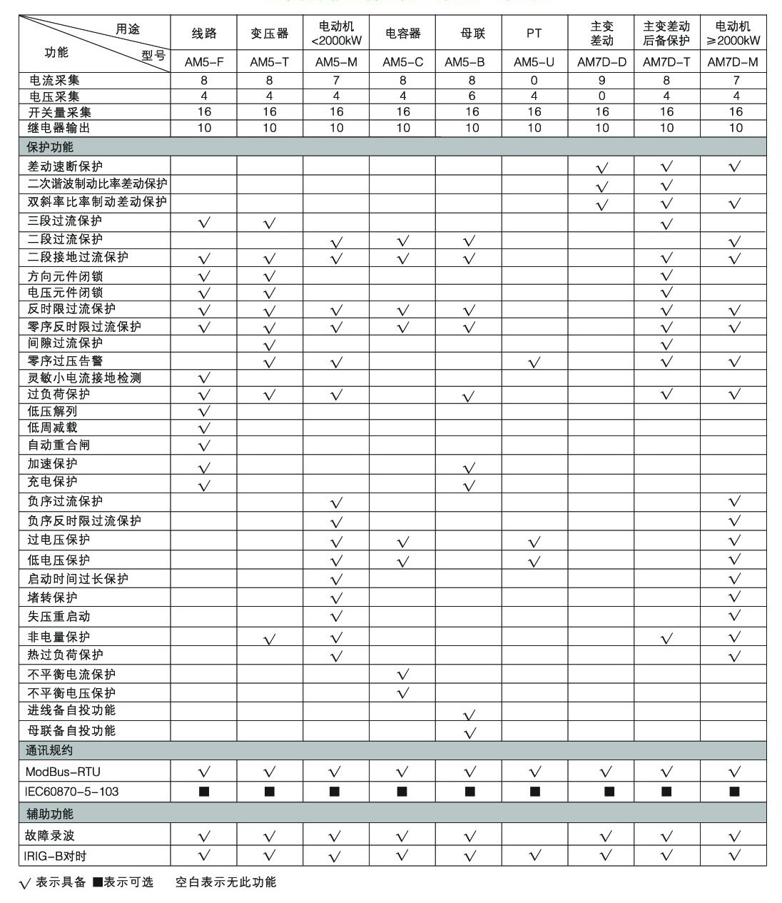 AMЗащита серии имеет верх Функция, но не ограничиваясь верх Функция в более сложной сети электроснабжения и распределения,AMСерия защиты микрокомпьютера может быть сконфигурирована с более сложными комбинациями функций защиты. Подробнее о комбинациях функций см. низ Таблица.