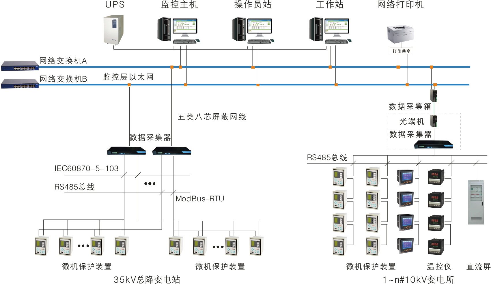 Оптоволоконная звезда Ethernet подходит для больших и рассеянных источников питания и распределения. система , Например, интеллектуальное распределение электроэнергии на крупных заводах и торговых площадях. система , пакет содержит Полная подстанция или коммутационная станция и несколько10kVПодстанция. Чтобы упомянуть высокая система Надежность, как уровень управления на уровне станции, так и Ethernet, и полевая шина могут использовать дизайн двойной сети с резервированием.