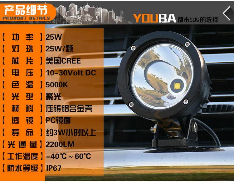 Описание товараэто стиль Автомобильная работа свет Импортированный кри свет Бусины, одна 25Вт, высокая Яркость и дальность действия. Является одним из осветительных приборов, для бездорожья надо выбирать.