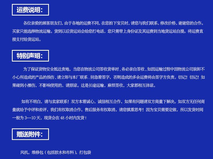 4.4. Сопутствующие аксессуары: с в подарок Соответствующий вентилятор, пожизненная гарантия в подарок Клей и ремонтные материалы.
