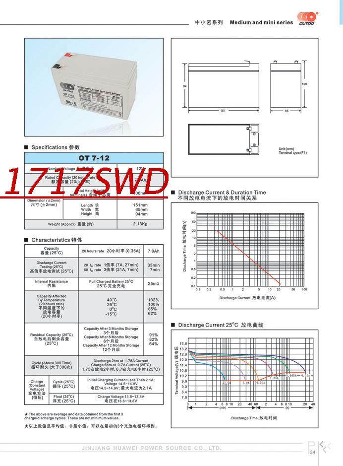 Номинальная мощность (20 часов): 7ah