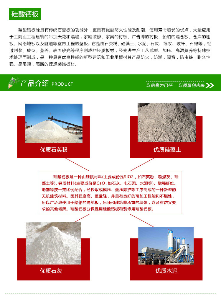 Силикат кальция панель Сырье высокая Кварцевый порошок чистоты, высокая стандартный Цемент, высокая Уплотнение чистоты извести, растительного волокна и других минеральных добавок.После того, как сырье смешивают кремниевый кальций, соединение было скопировано и было скопировано, а затем после дня. высокая Пар в пар.