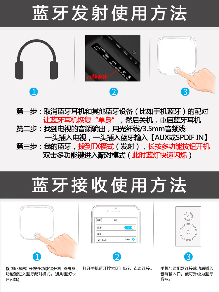 *  BTI-029 поддерживает первую функцию(Два трехмерных звука могут быть подключены одновременно, когда состояние TX синий Зубной динамик или стерео синий Зубные гарнитуры, два динамика/наушники могут одновременно издавать звуки; два мобильных телефона могут быть подключены одновременно, когда состояние RX в настоящее время только могу имеет Мобильный телефон говорит, какой телефон - это звук того, какой мобильный телефон сейчас)