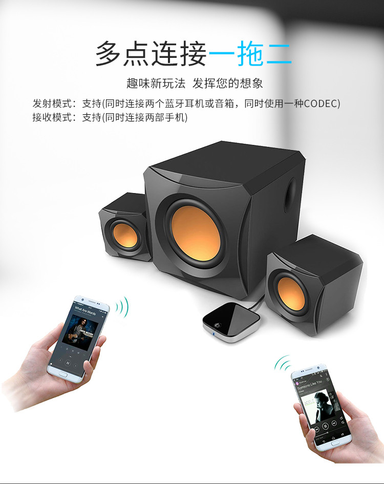 *  может быть поддержан с помощью протокола A2DP синий Звуковая коробка или соединение гарнитуры, состоящее без Line Sound частота Трансмиссионная сеть, применена на телевидение, CD, домашний кинотеатр и другое оборудование верх ; Вы также можете подключиться со своим мобильным телефоном/компьютером, чтобы воспроизводить музыку.