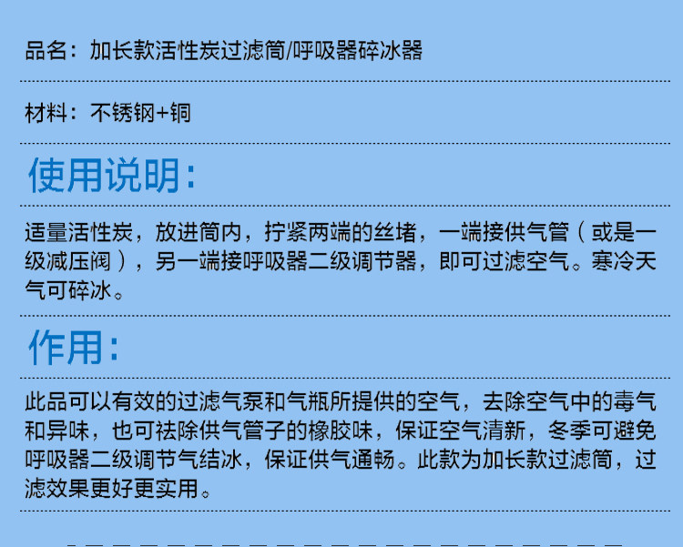 Примечание. При установке активированного углеродного стержня будет прикреплено небольшое количество активированного углеродного порошка. Перед использованием фильтровая трубка будет подключена к вентиляции воздушного насоса или газового цилиндра в течение 5-10 минут для удаления активированного углерода в породе фильтровая трубка.