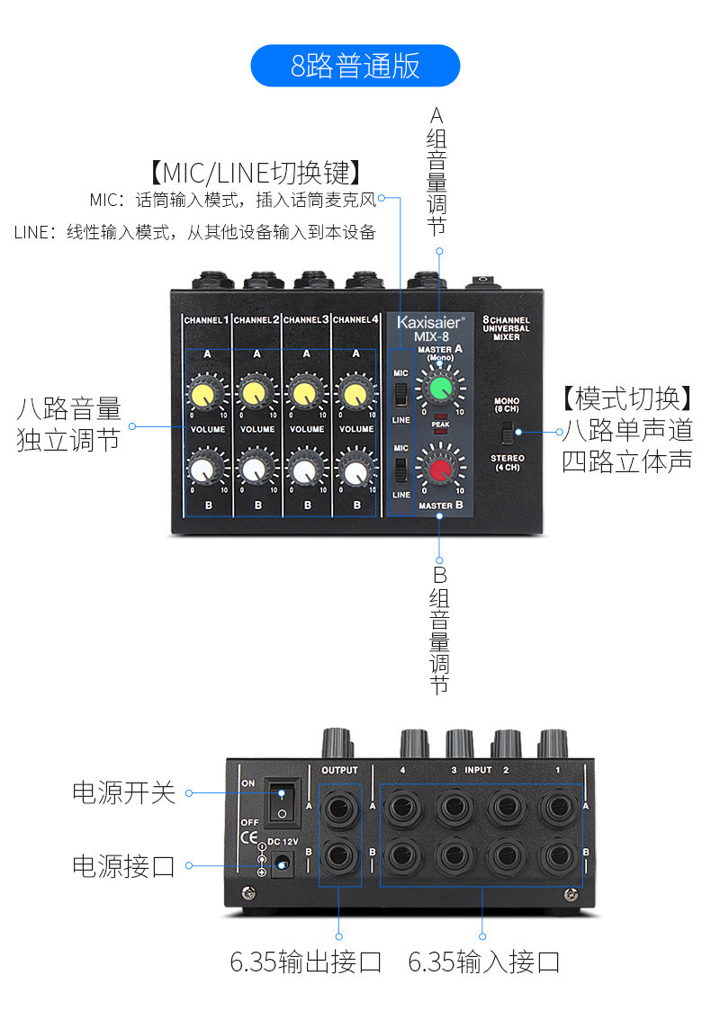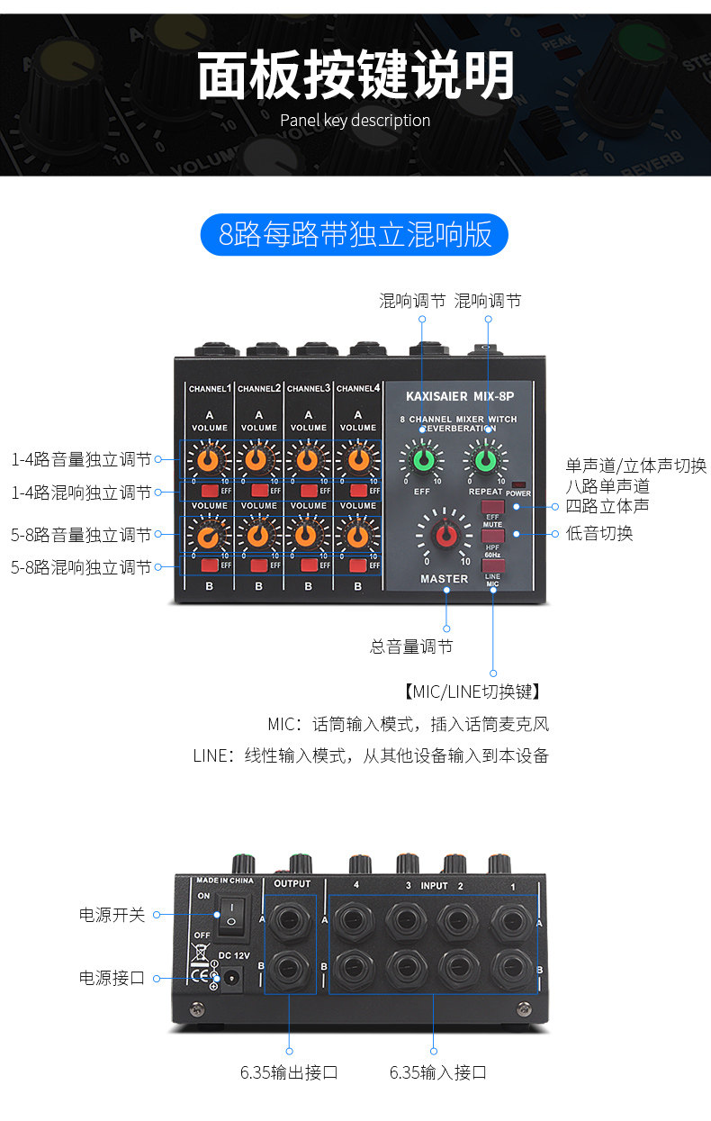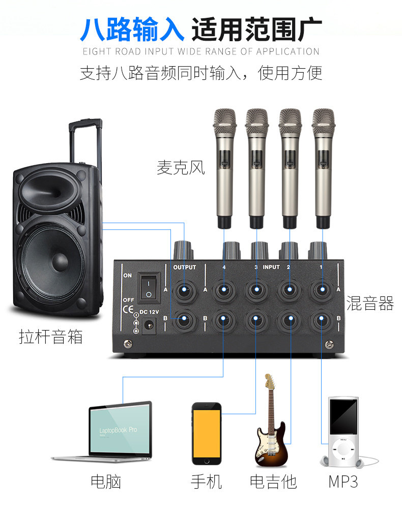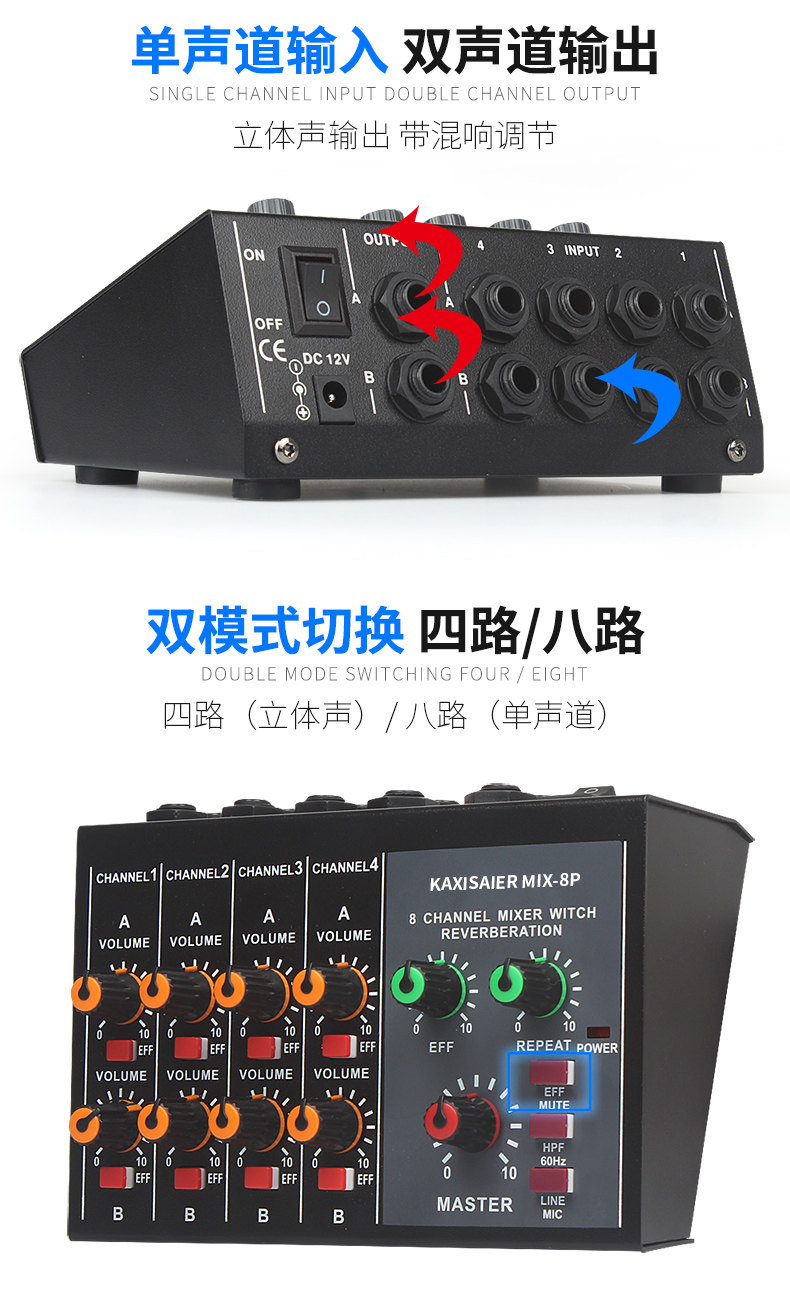Kaxisaier Mix-8 Reverbeter 8-канальный микшер Мини-микшер Малый музыкальный инструмент Микрофон расширитель