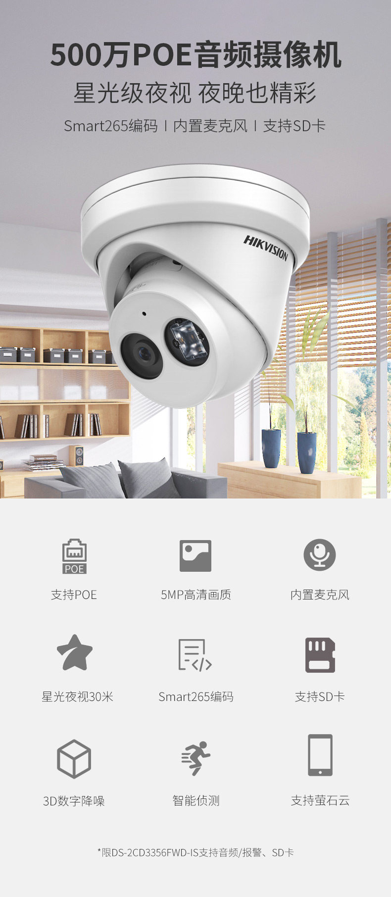 Hikvision 5 миллионов POE Starlight Sound частота высокая Мониторинг в помещении мобильного телефона с четким ночным видением камера 3356WD-I
