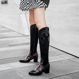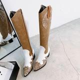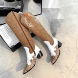 Винтаж Запад джинсовый Женские сапоги смешанные цвета широкий каблук ботинки женский змеиный принт высокие Сапоги с острым носом Рыцарские сапоги женские сапоги прилив