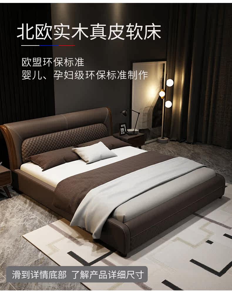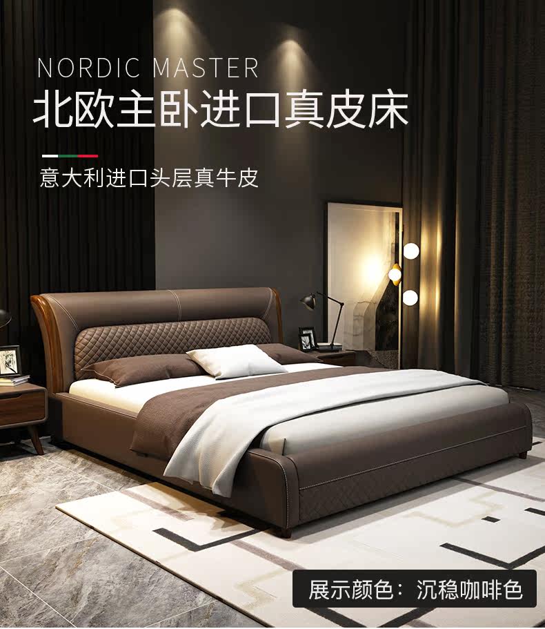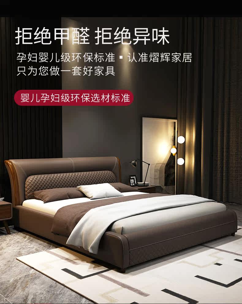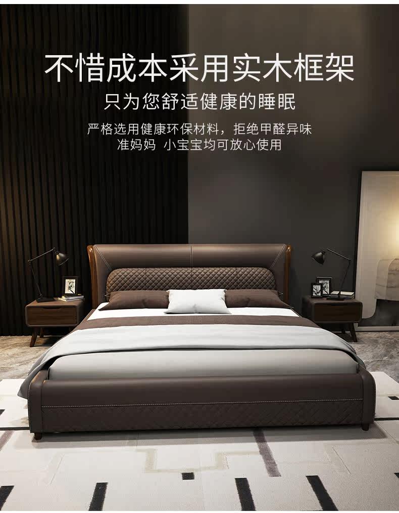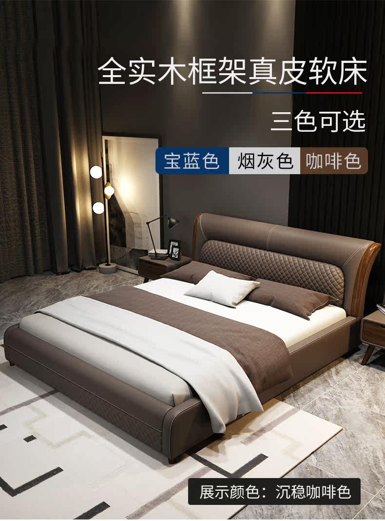 Блестящий из натуральной кожи Кровать главный спал поколение Простая 1,8 м Двуспальная кровать Nordic Light Luxury Wood Mell Apartment Кожаная Свадебная кровать