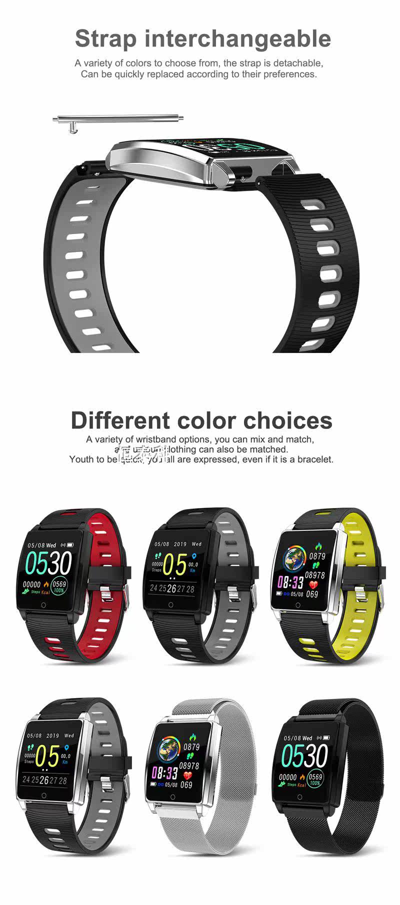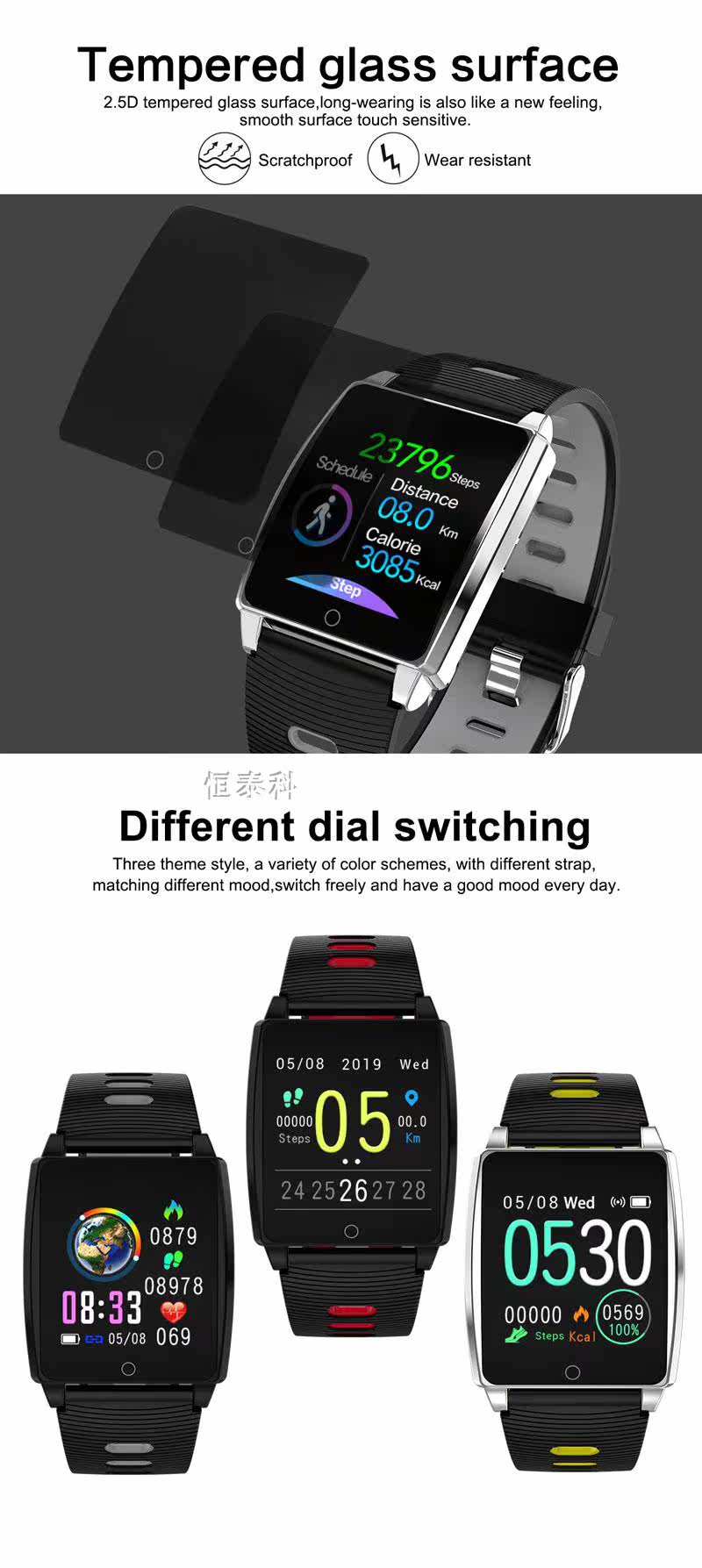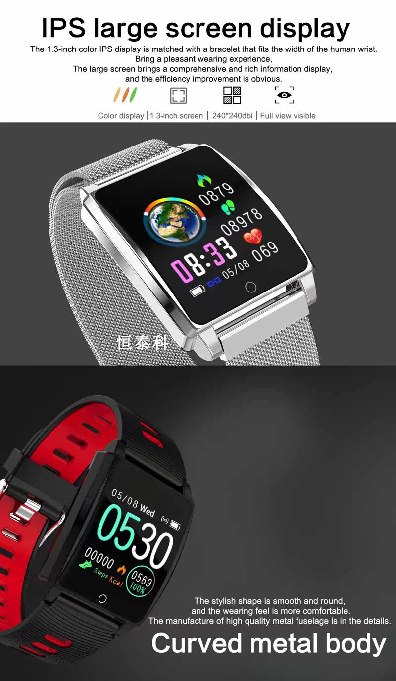 1.1.3 inch Big HD IPS Color Screen. Different dials for selection. Heart rate ,calorie, time, step could be