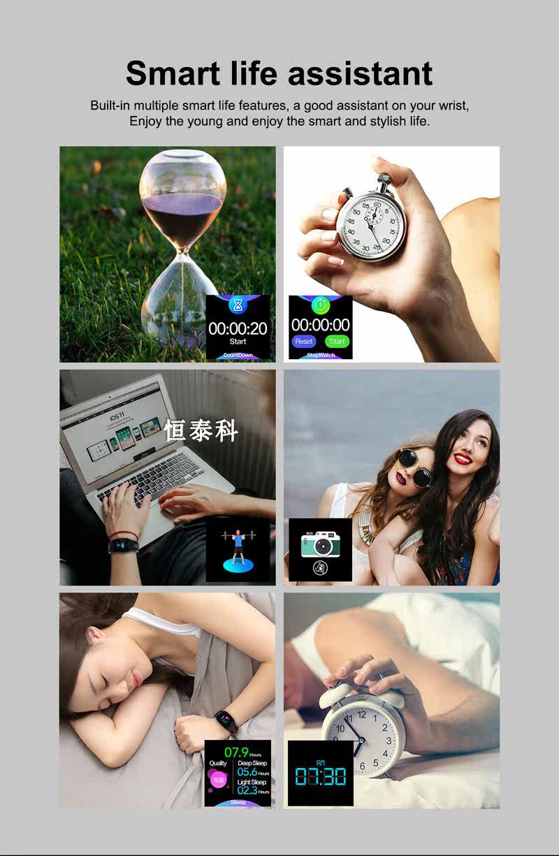 5. More functions such as alarm reminder, sedentary reminder, flip screen, do not disturb mode, anti-lost.
