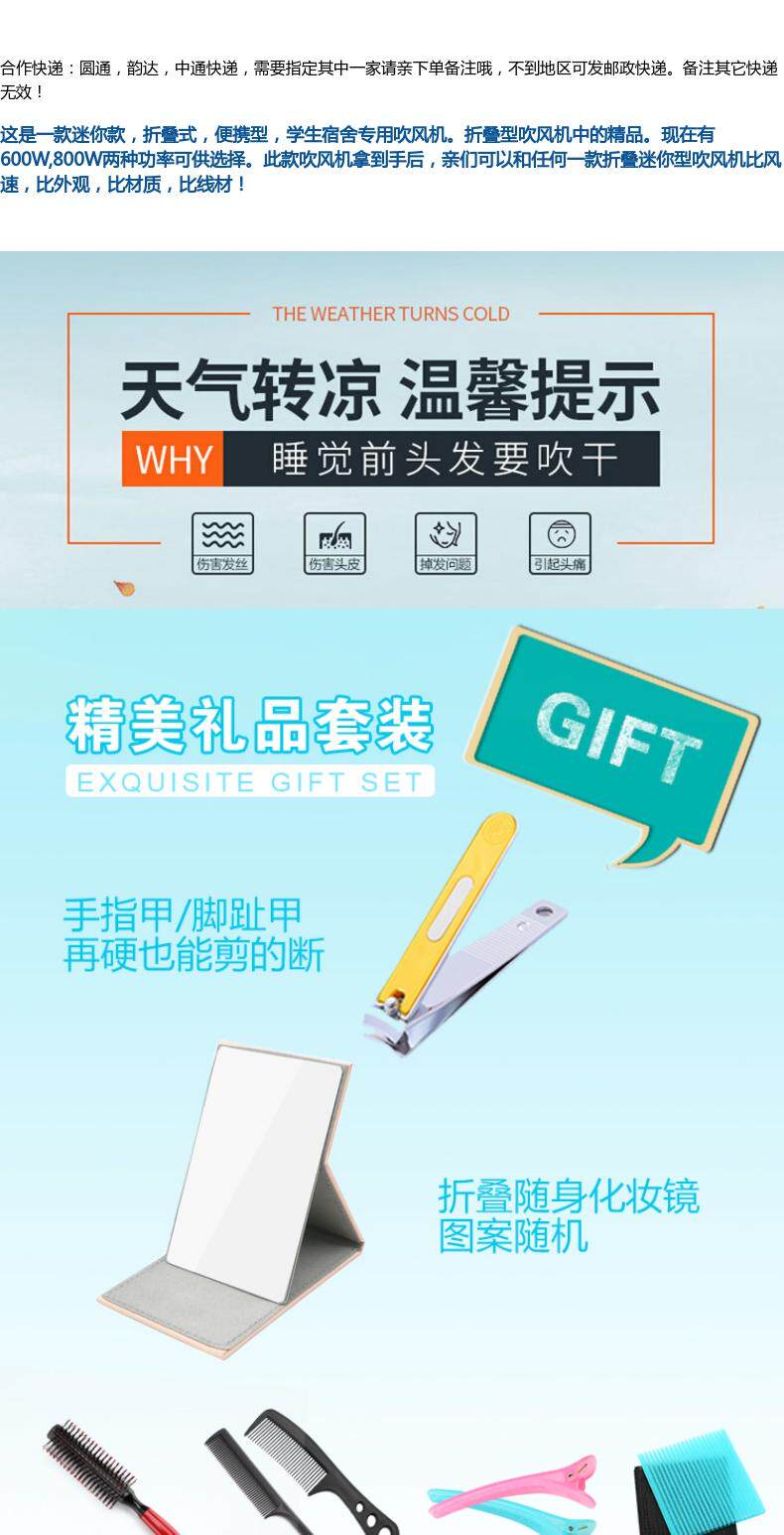 Это одно стиль Мини стиль С со складыванием Формирование, портативное, студенческое общежитие для фен. со складыванием Бутик в фен.Теперь имеет 600 Вт, 800 Вт питания на выбор.это стиль После того, как фен получает руку, дорогая может быть с любым стиль со складыванием Мини -фен сравнивается с скоростью ветра, больше, чем с внешним видом, большим количеством материала и нитью!