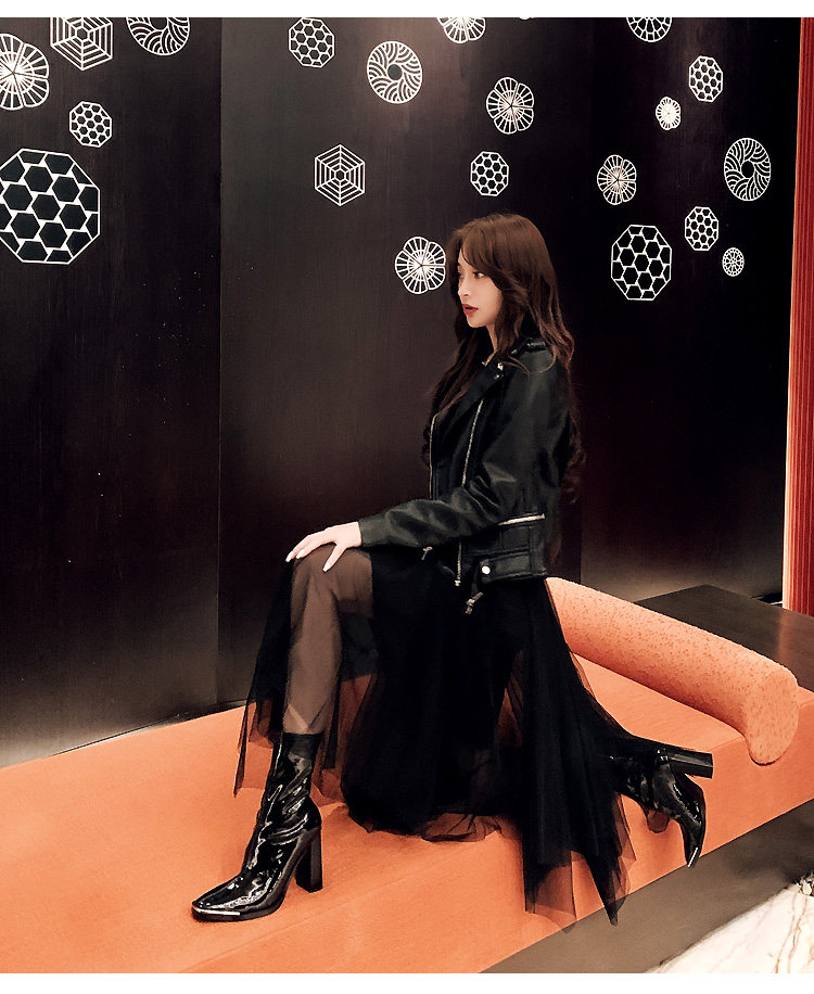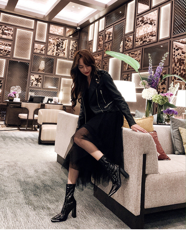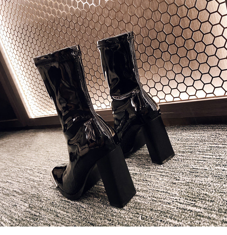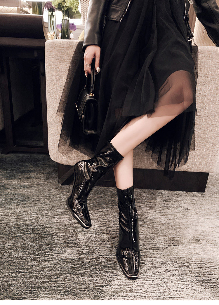 Кериш фасон унисекс Женские ботинки эластичные Сапоги лаковая кожа средние Сапоги на высоком каблуке металлический Квадратная голова широкий каблук ботинки женский широкий каблук Женские ботинки