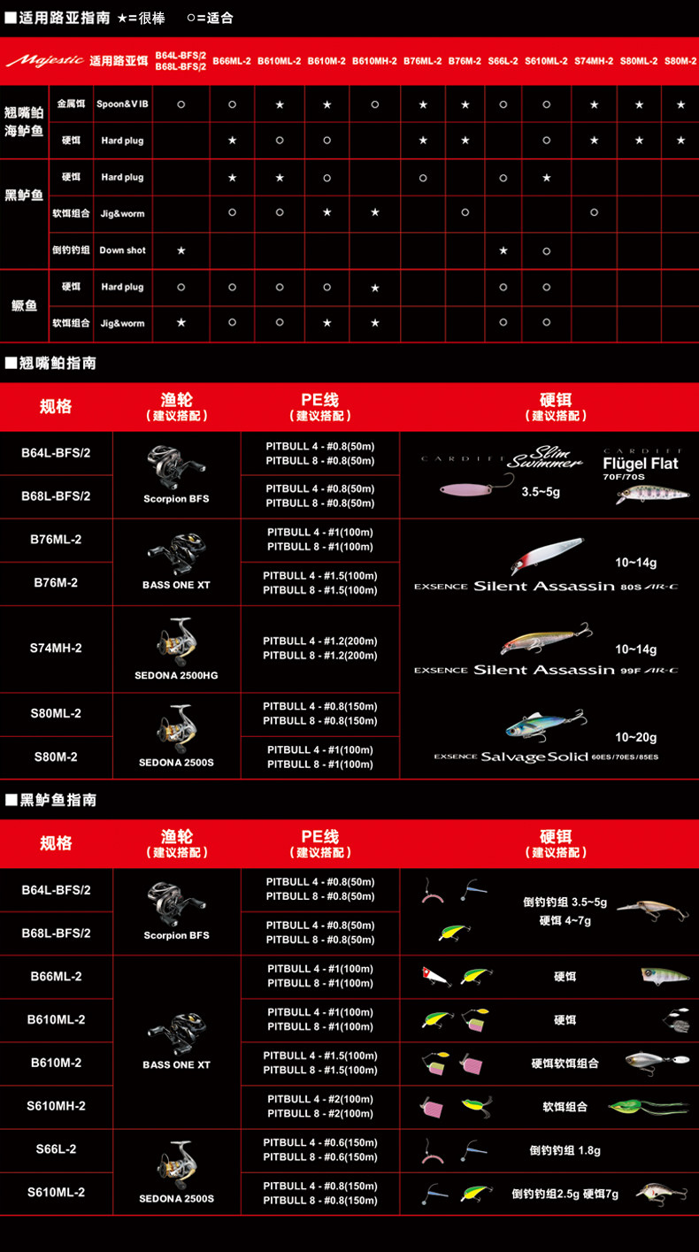 Цвет: B64L-BFS / 2(Плавная регулировка рукоятки пистолета 1,93 метра), B66ML-2(Ручка средней мягкости 1,98 метра.), B68L-BFS / 2(Плавная регулировка рукоятки пистолета 2,03 метра), B610ML-2(Мягкая регулировка 2,08 метра в ручке), B610M-2(Средняя регулировка ручки - 2,08 метра.), B610MH-2(Жесткая регулировка 2,08 метра в ручке), B76ML-2(Мягкая регулировка 2,29 метра в ручке), Б76М-2(Средняя регулировка ручки - 2,29 метра.), S66L-2(Плавная регулировка прямой ручки 1,98 метра), S610ML-2(Прямая стойка со средней плавностью регулировки 2,08 метра), С74МХ-2(Прямой хвостовик средней жесткости, регулировка 2,24 метра), S80ML-2(Прямая стойка со средней плавностью регулировки 2,44 метра), С80М-2(Регулировка средней стойки прямой стойки 2,44 метра)