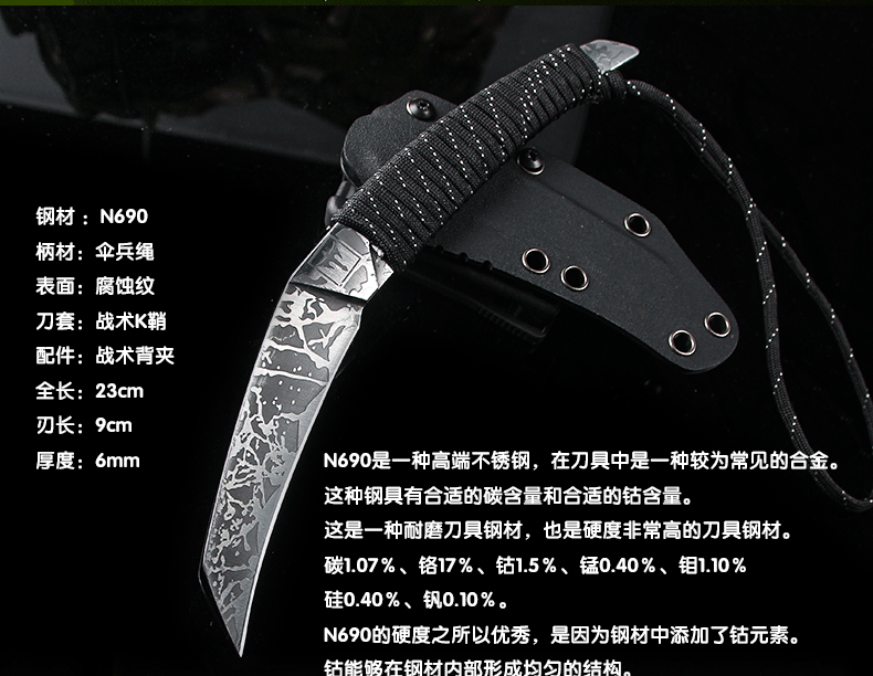 Угол указателя ножа: 60 ° низДлина ручки ножа: 12cmЦвет: Тигр, Орел пустыни, Охота зеркало лапша, Смерть с косой, Лиственные листья, Герой, Нож когтя волка, Трансллый когтя ножЛезвие: 9.9cm
