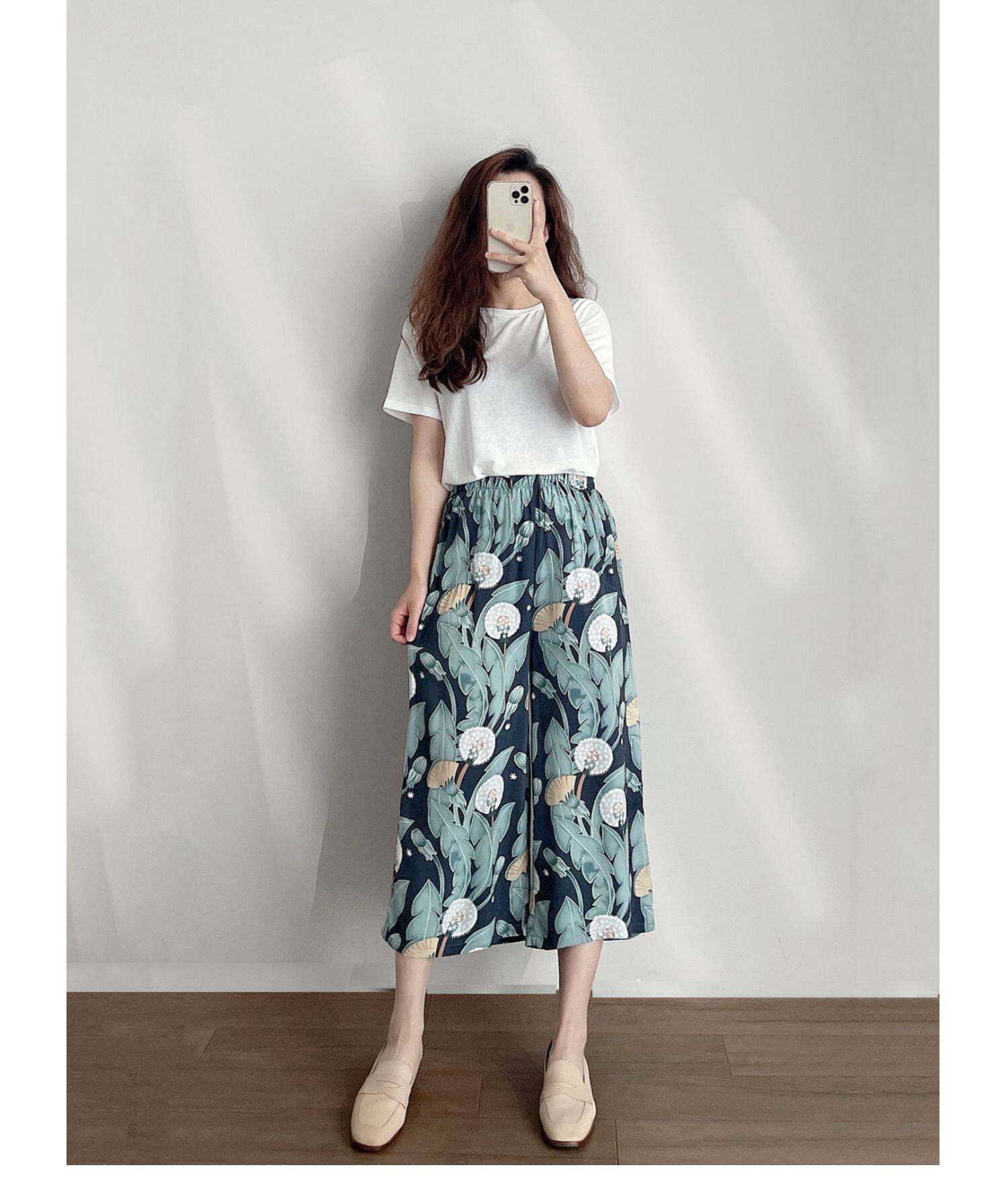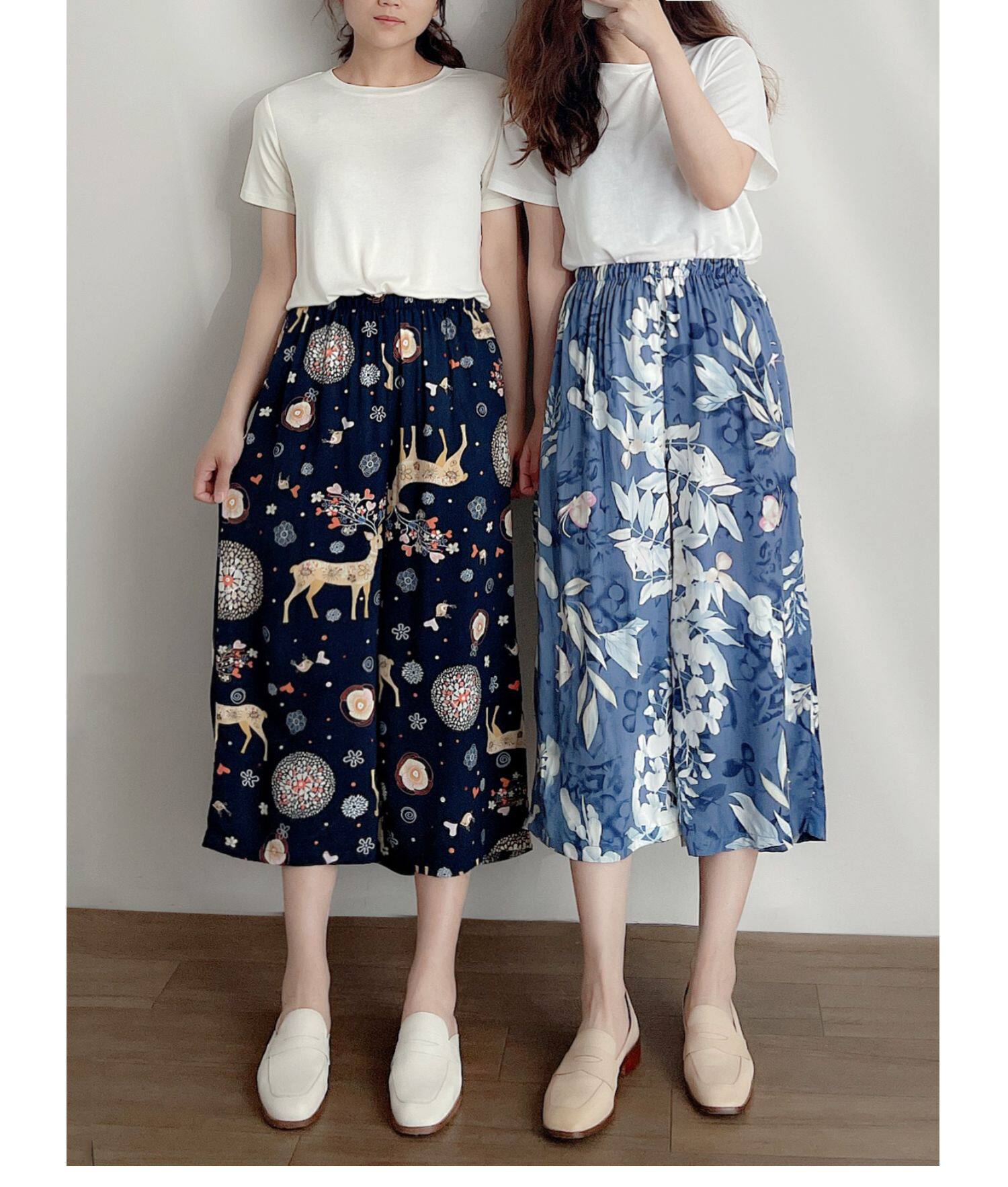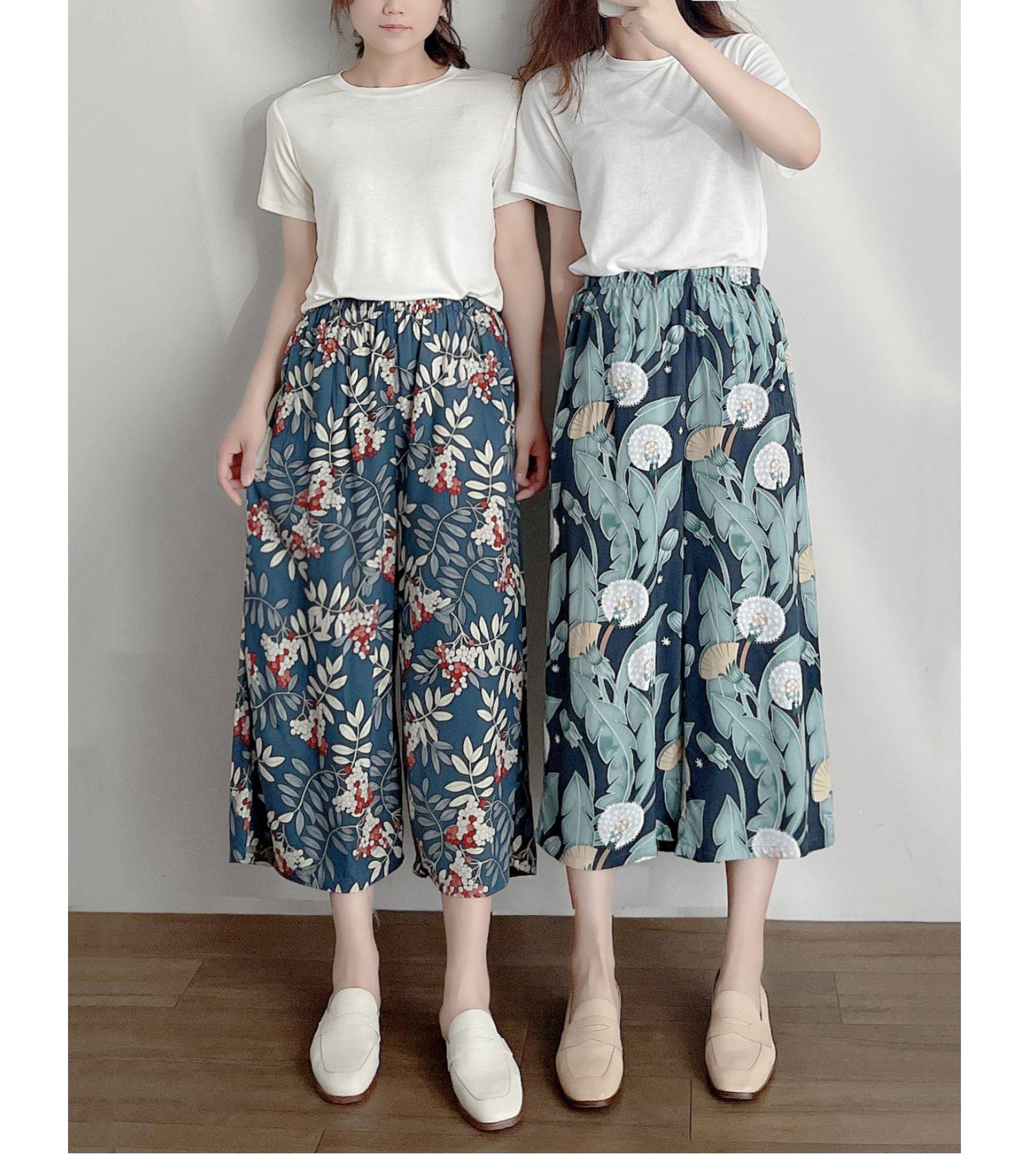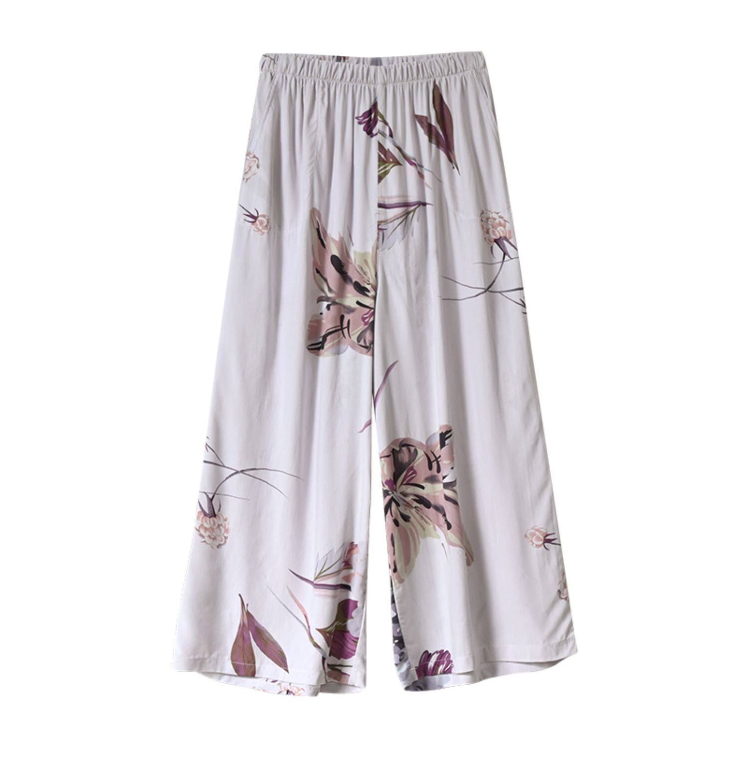 Лето женский люди хлопок Широкие ноги Полный печать цветок Летние воротники штаны 7 Летние штаны стиль Женская одежда