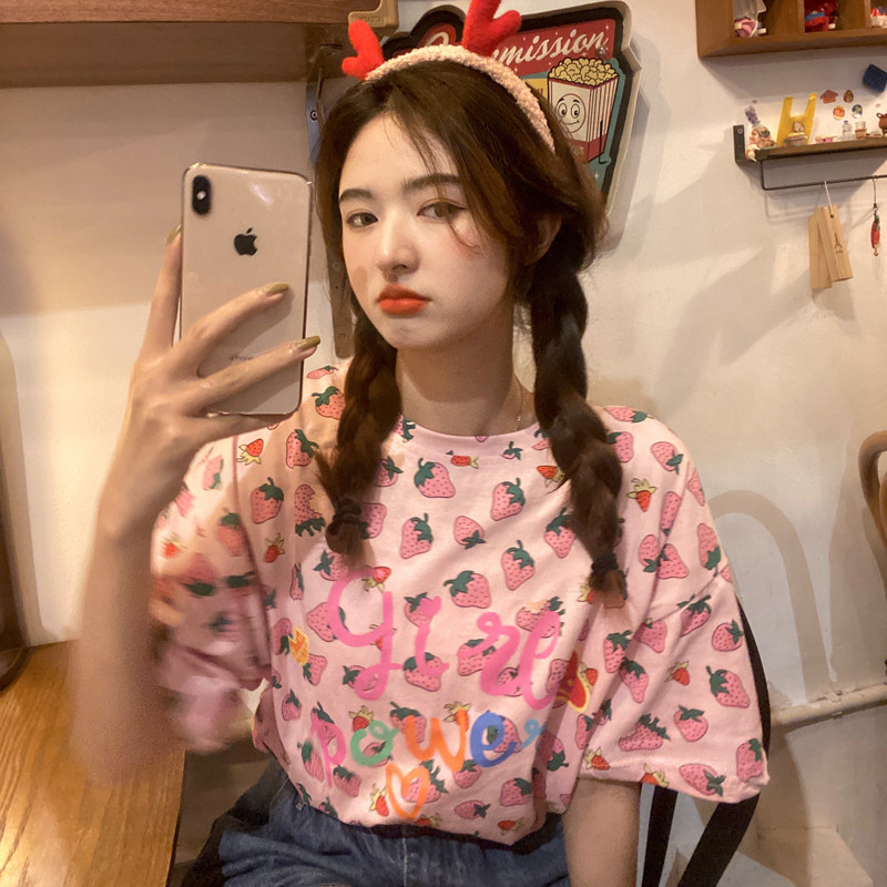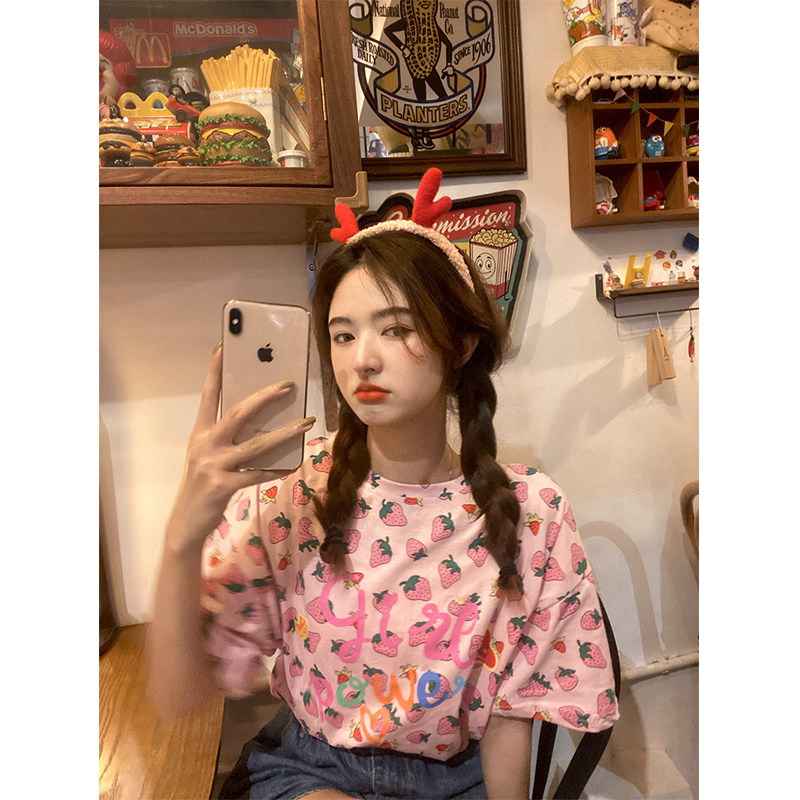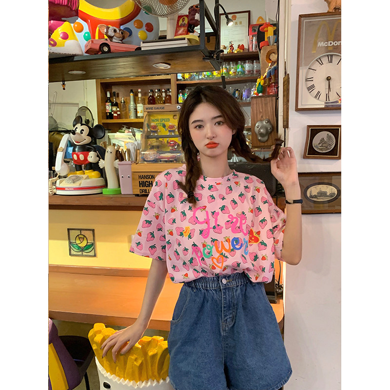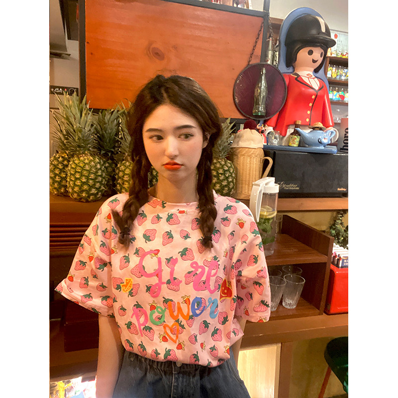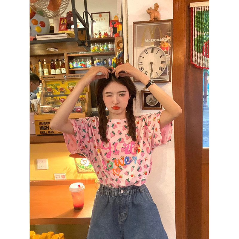 Лето 2021. новая коллекция Сладкая клубничная печать свободно фасон средней длины стиль слово Мать сотни лет короткий рукав Футболка верх Одежда