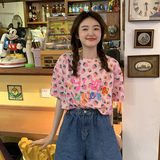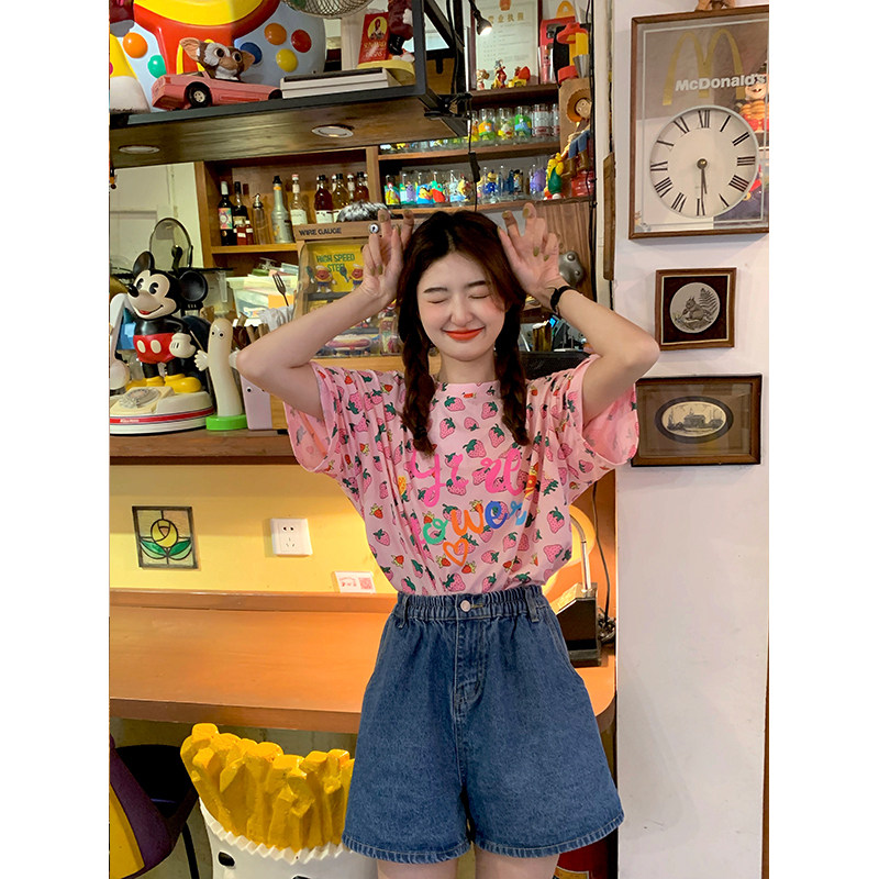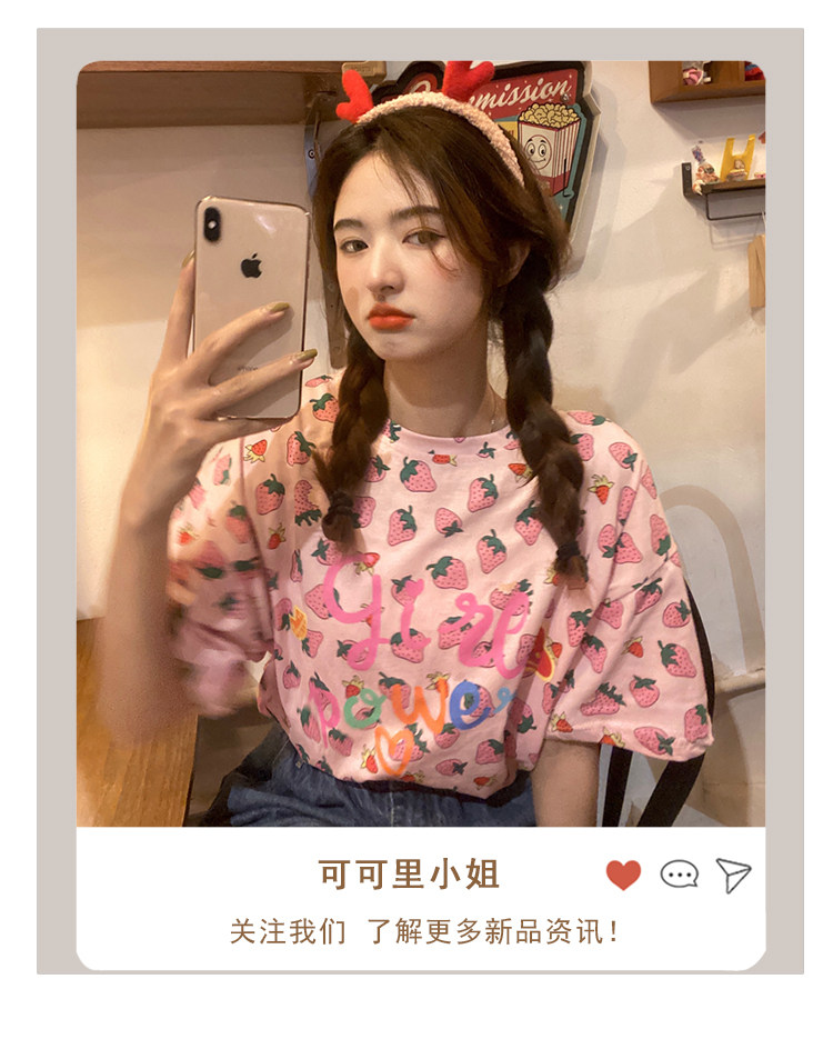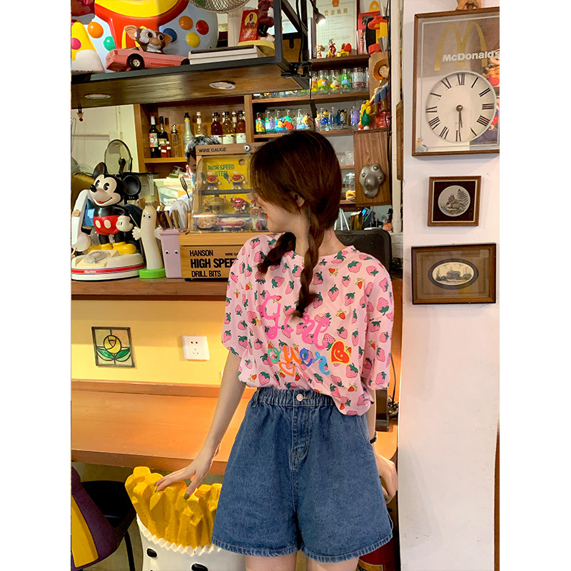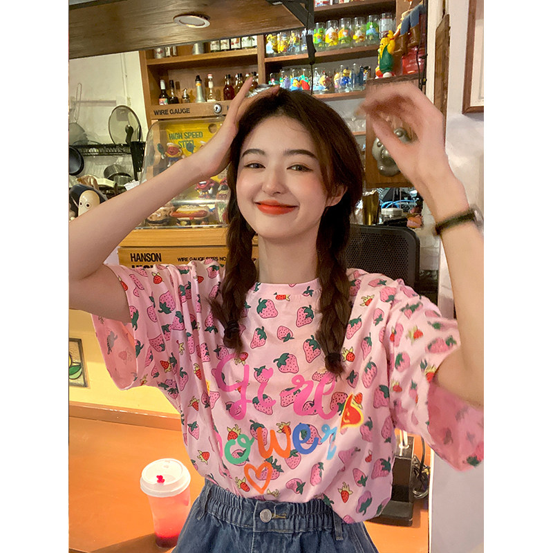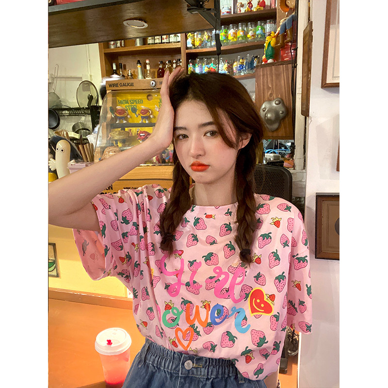 Лето 2021. новая коллекция Сладкая клубничная печать свободно фасон средней длины стиль слово Мать сотни лет короткий рукав Футболка верх Одежда