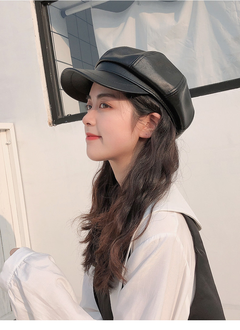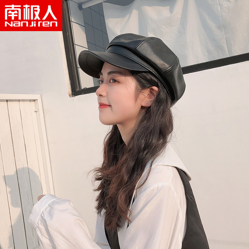 Антарктика шапка женский осень-зима корейская версия Дикий черный кожзаменитель 质 八 角 английский стиль винтаж Утиный язык прилив