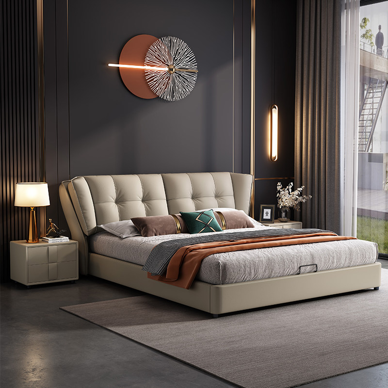 Двойная кровать главная спальня 2023 года новая коллекция Легкая роскошь поколение Простой из натуральной кожи Кровать главная спальня двойная кожаная свадебная кровать сплошная деревянная кровать